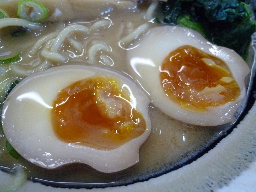 醤油の味玉は見た目どおりにしっかり味。ちょっと茹でるのに失敗してますが味のほうには影響なしかと。