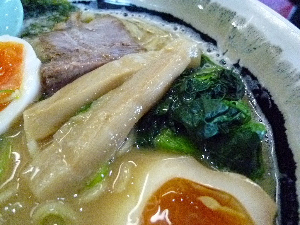 メンマは極太。独特のにおいがちょっとありましたが悪くはないです。ほうれん草は冷凍ものかな。半熟のゆで玉子が半分入るのは見た目にもボリューム的にもいいですね。