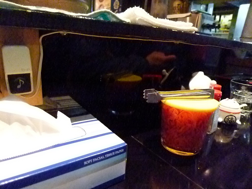 卓上調味料から離れた場所に座ったんで詳細は分からず。本店を踏襲してるなら揚げニンニクがあると思うんですが。替え玉等で店員さんを呼ぶ場合にはベルを押すと良いみたいです。酔客で雑然とした店内では気の利いた配慮かも。