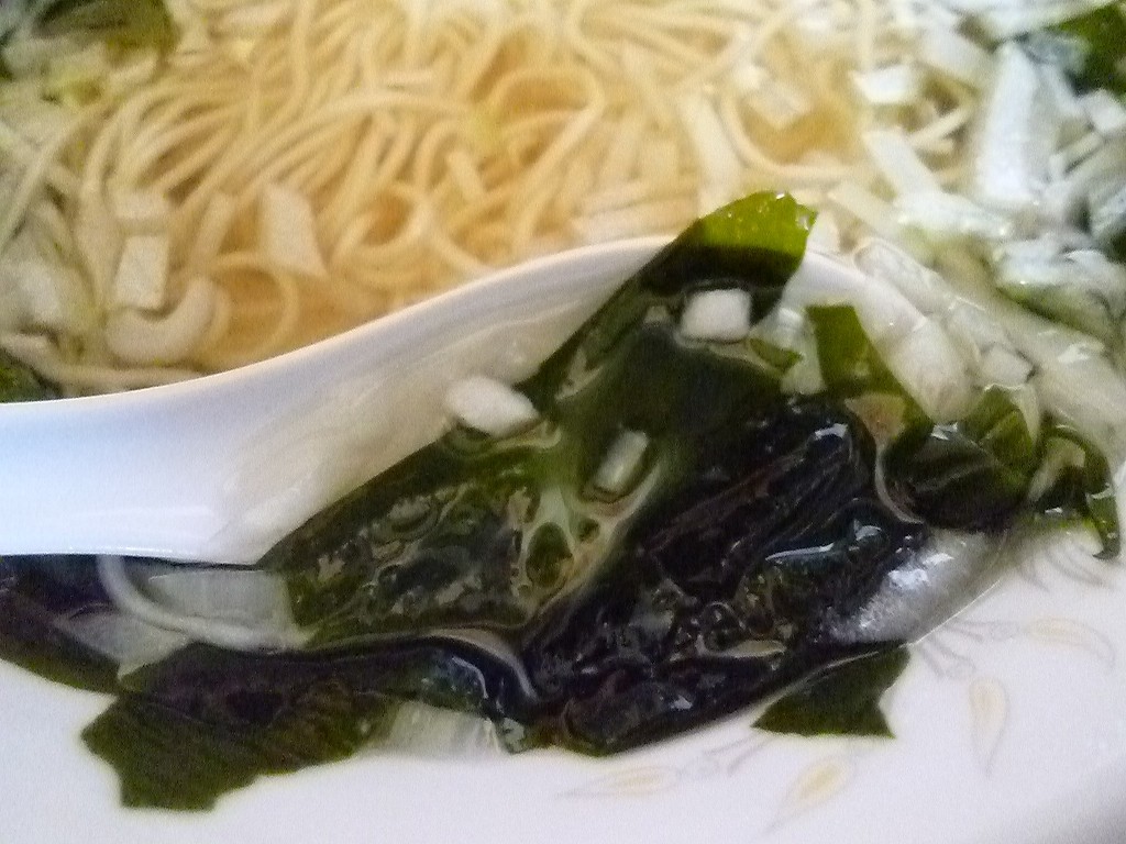 具には麺を囲むように肉厚のわかめと多めの玉ねぎ。うん、このままだと単調で飽きるね。