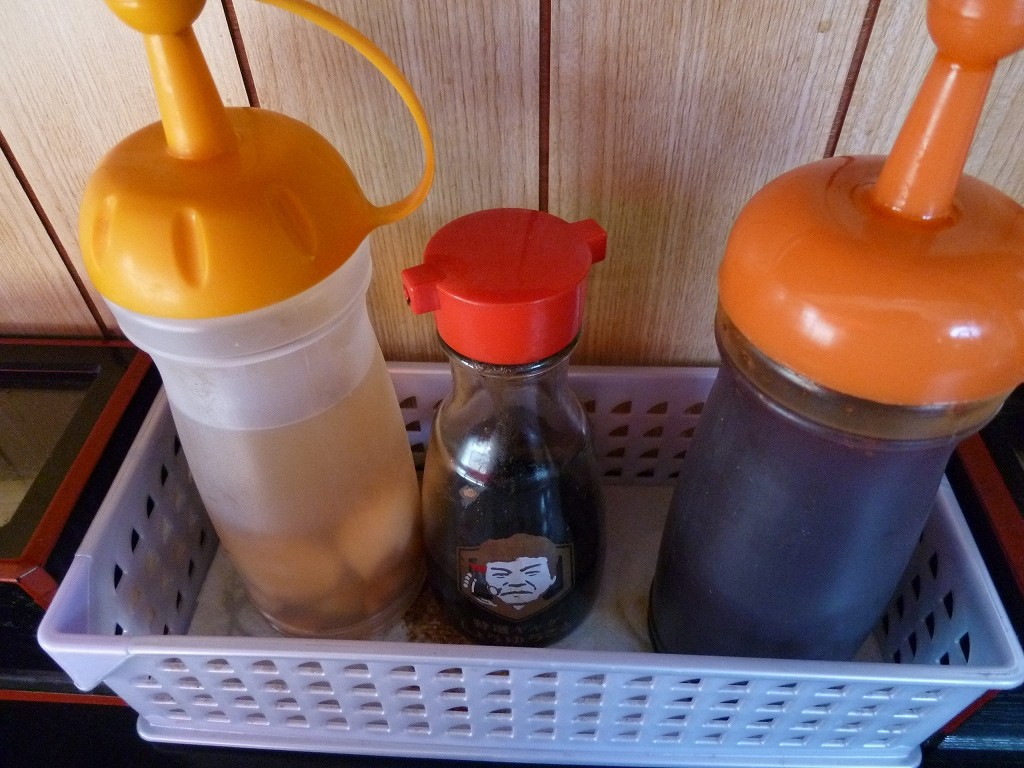 卓上調味料はお笑い芸人さんの顔が入った醤油ににんにく入りのお酢、そして平塚系で忘れちゃならないラー油ですね。