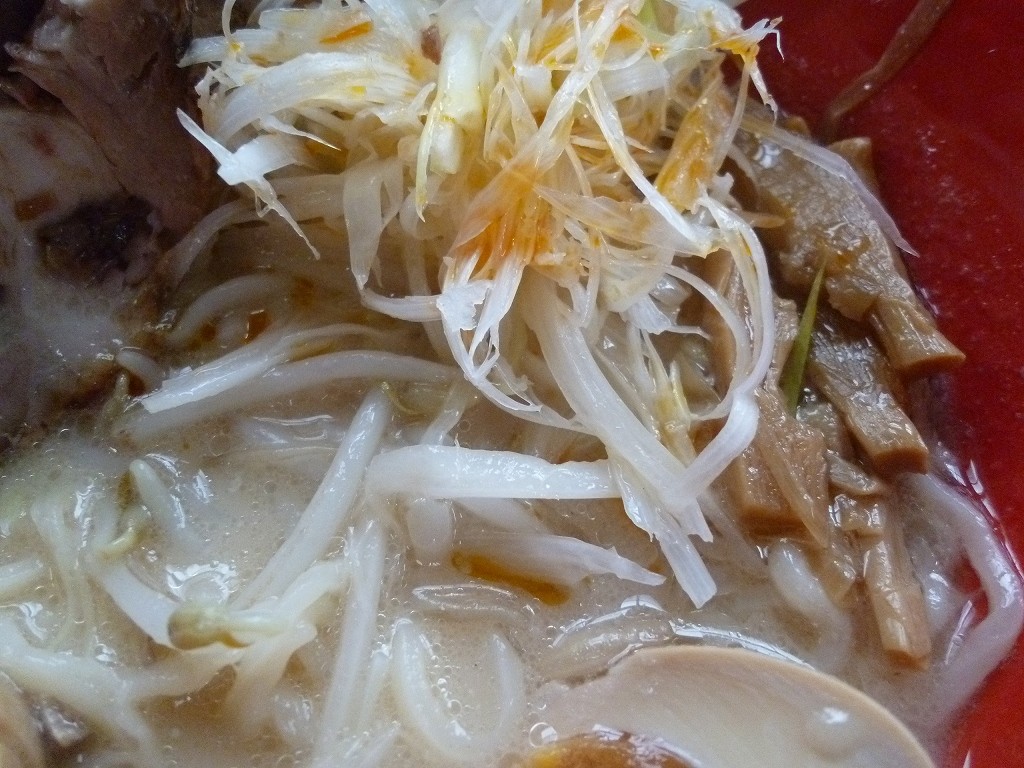 ちゃんと曝されて臭さが抜かれたネギにはラー油がかけられます。メンマは柔らかでしっかり味付け。ネギの下には少しですがもやしも入ってきたりして。いろいろな食感が楽しめる脇役群になってます。