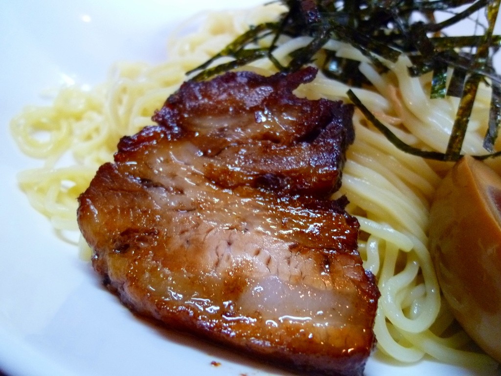 チャーシューはオーブンで炙られ提供直前にタレに浸してから提供されます。カリッとしつつトロっと消えていく食感で甘辛な味付けがしっかり。つけ麺ではチャーシューをつけ汁に浸すことが多いですがこちらはそのまま食べなきゃダメ。ゼッタイ。