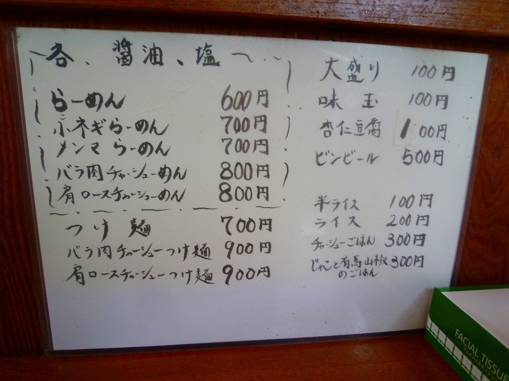 ほぼ1年ぶりの訪問ですがメニューの方に変わりなし。らーめんとつけ麺でどちらも醤油か塩から選ぶことになります。味の良さもさることながらコストパフォーマンスの高さも人気の秘訣なんでしょうね。