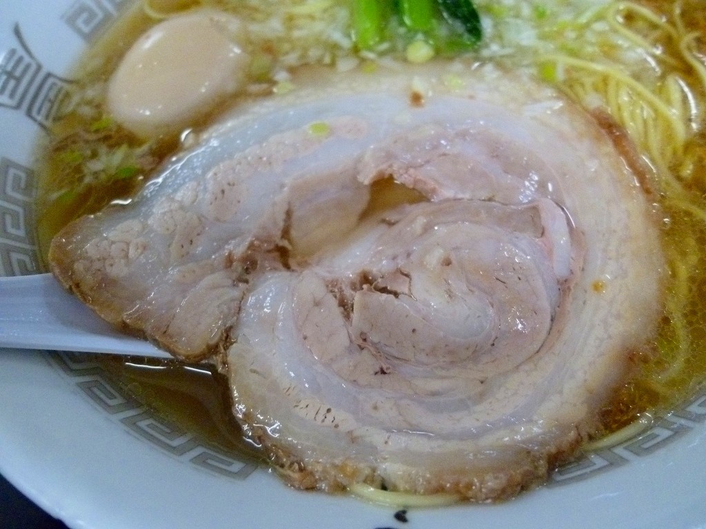 チャーシューは大判薄切りの巻きバラ。見た目に脂身が多くていかにもしつこそうですが豚の質が良いためか薄切り大判といった形状で一度に口に入る量が限られるためか脂身を感じながらも案外さらっと口に溶けていきます。