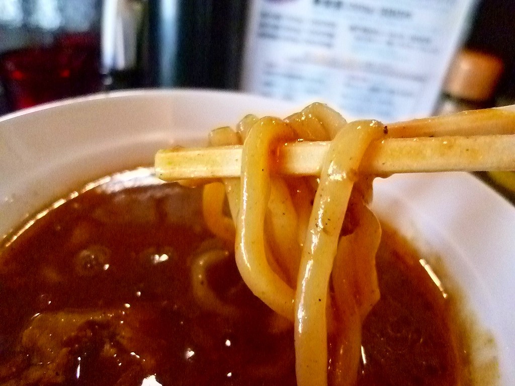 つけ汁は甘めなどろ系カレー。特に指定がない限りは中辛でお出ししてますとのことで中辛にしましたが辛さはほとんど感じません。カレーに関して多く語れないんですが油が多くも油っぽさはなく絡みが良いことで極太の麺をも圧倒する複雑な風味がありました。さすがはカレー専門店をやってただけのことはありますね。素直に旨い。