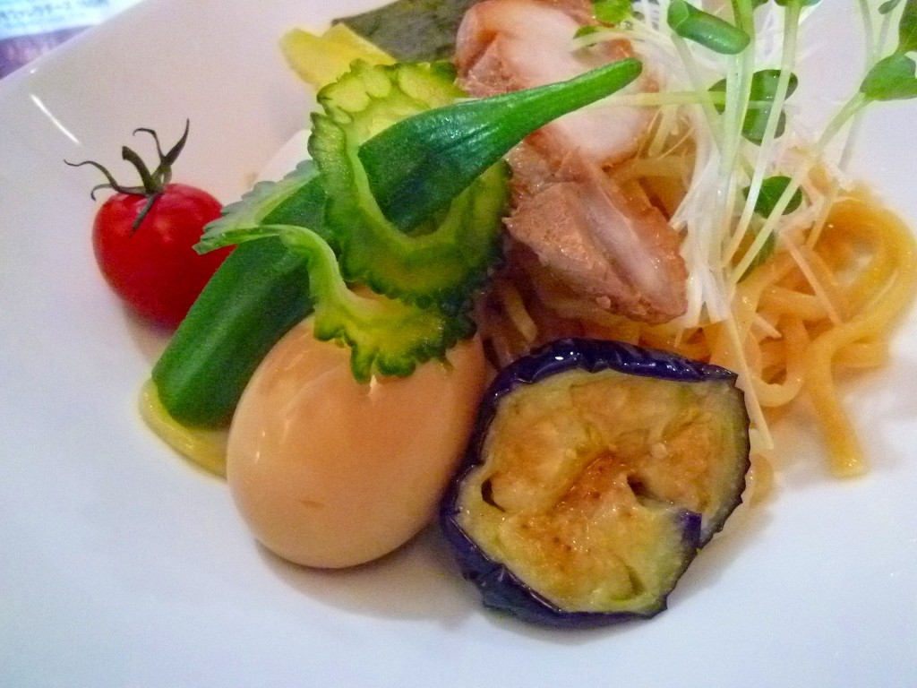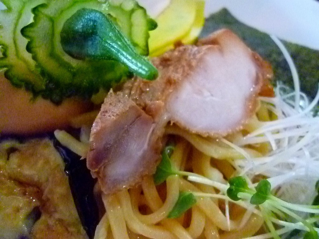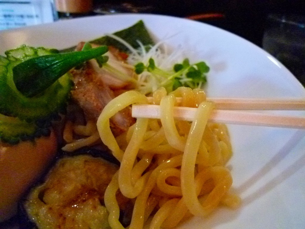 麺は太麺を選択。極太といっていい太さでガシガシと強い歯ごたえがあります。おそらくは氷水で〆てるんでしょうね。キッチリ冷たくいきなり好感が持てました。