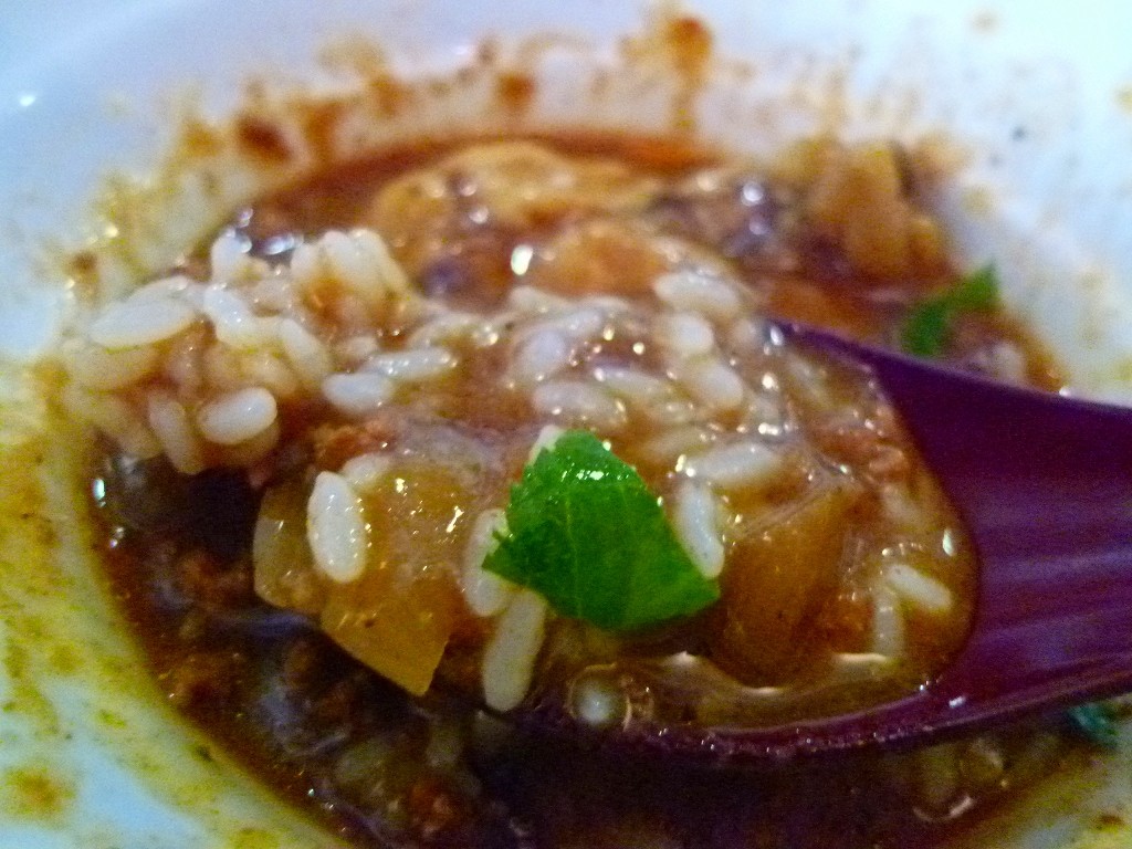 とはいえ味玉には触れておかねば。ちょっと固めな半熟ですが濃厚カレーに負けないようにかキリッとした醤油の味付けが染み込んでました。半分はそのまま、もう半分はカレーにくぐらせてから食べてみましたがカレーと玉子って仲良しなんだなぁとつくづく。