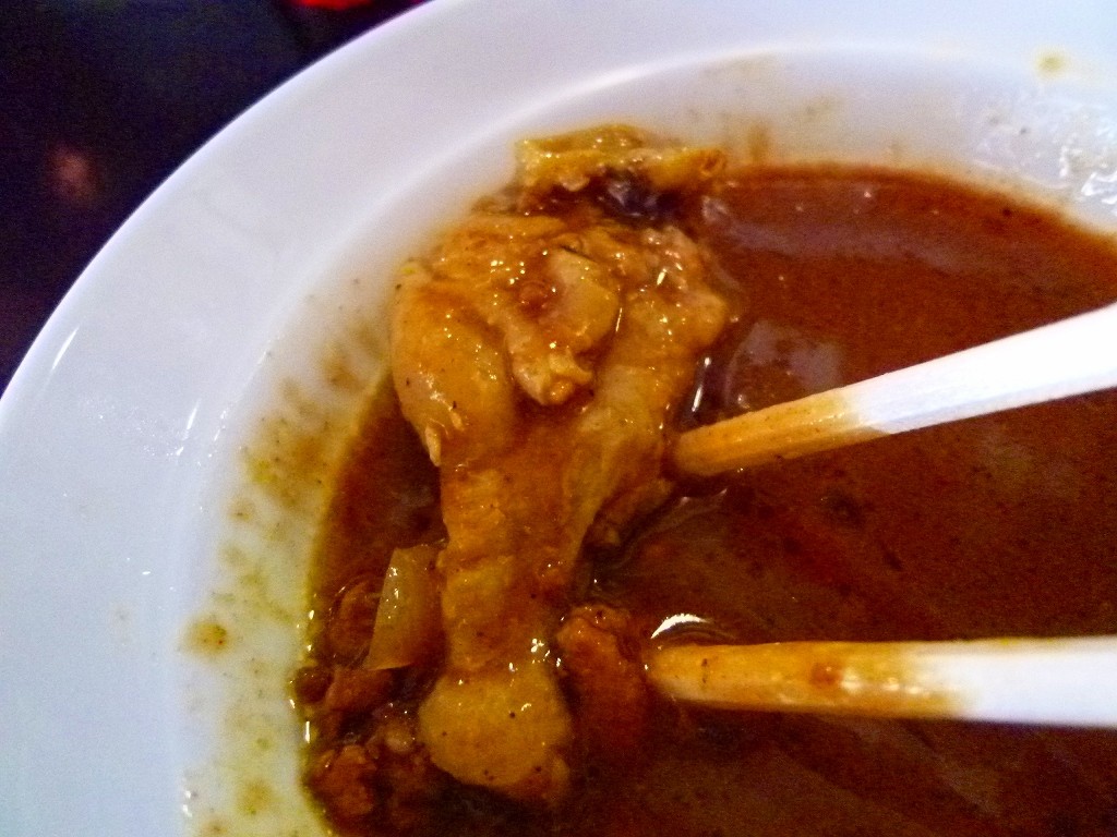 チャーシューは麺の上に大ぶりに切られた鶏モモの塊。醤油ベースの味付けがしっかりしてます。このままでも美味しいですがカレーにくぐらせても美味しかったです。