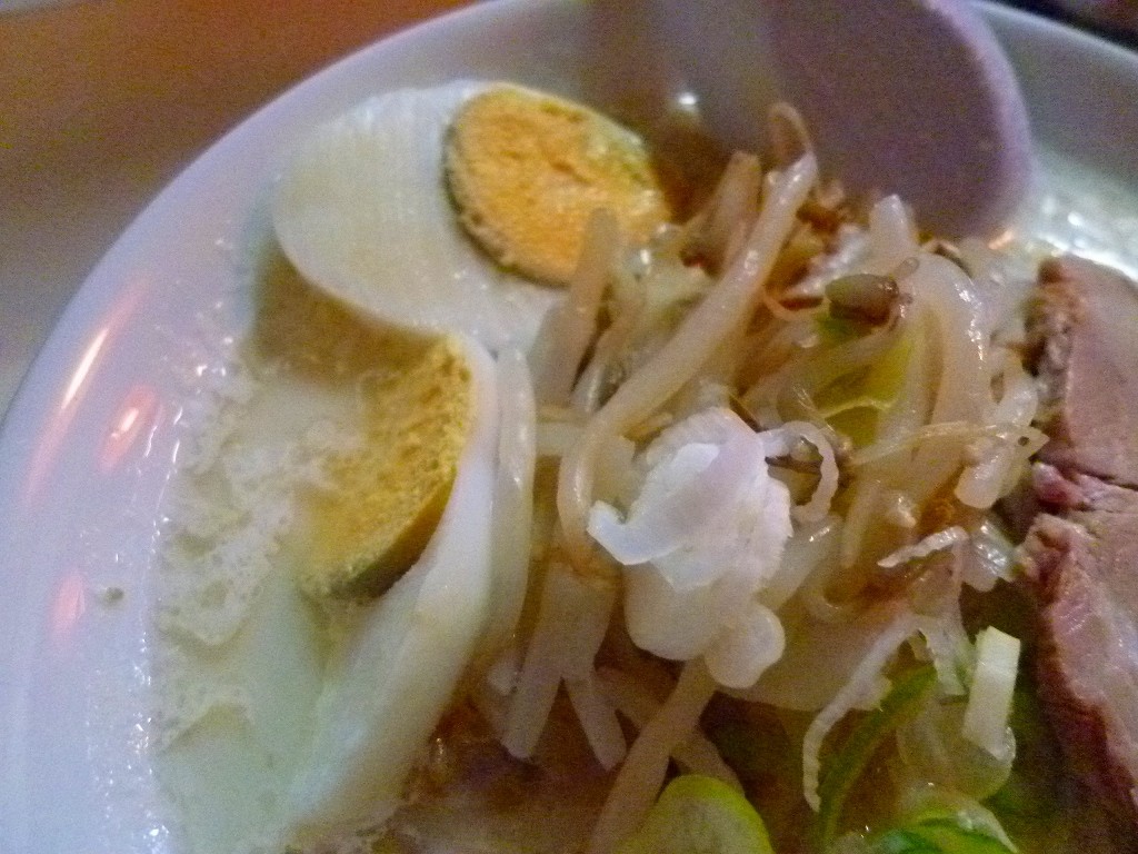 脇役には茹で置きの味付けもやしキャベツにゆで卵のスライスが入ります。昨今のラーメンシーンを鑑みるとイマイチなんでしょうがなんとなくでも正統派と思わせてくれるのは雰囲気によるものかなんなのか。全然違和感なく美味しくいただけました。