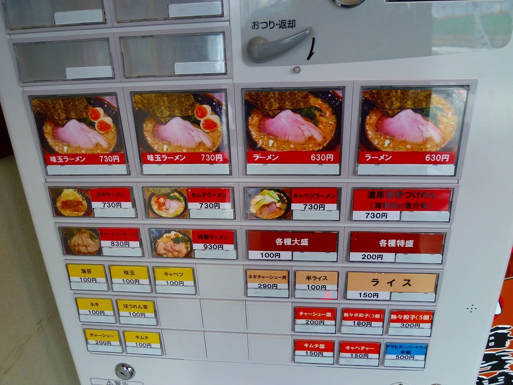 お店を入って左手にある券売機。基本的に横浜家系とんこつ醤油なんですがつけ麺は魚介か海老かを選べる模様。ランチタイムには曜日問わずで半ライスがサービスになります。