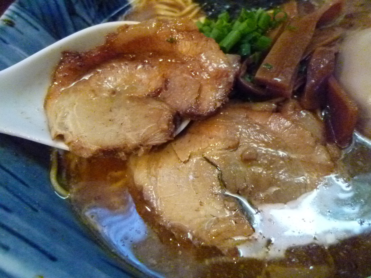 チャーシューは非常に脂身の少ない巻きバラの薄切りが2枚。口の中でほろほろと崩れていく柔らかさは舌で押しつぶせるくらい。でも味付けは濃いめで存在感があります。うーん。ここの焼豚丼は食べてみたいなぁ。