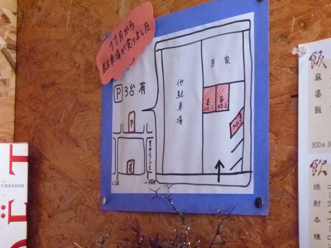 まずは注意事項から。11月1日より以前契約していた駐車場が使えなくなりお店の真裏の駐車場へと変更となってます。今までの2台から3台に増え、信号を越えなくて済む分近くなったと思います。