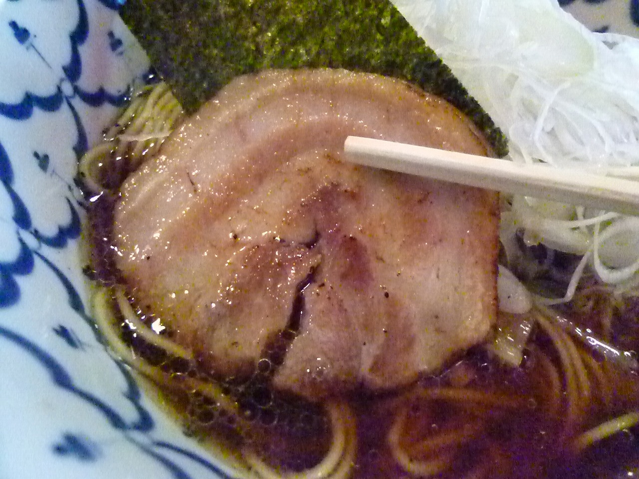 野菜は増したことによって小山盛りになった白ネギの下に水菜とメンマが潜んでます。水菜のほろ苦さにぱりぱりした食感は目先を変えてくれ、メンマはいかにもメンマらしいコリコリの歯ごたえと甘めな味付けが舌直し。たっぷりのネギはきちんと下処理がされていてネギ辛さはなくそのままで爽やか、熱を通して甘くと主役級の働きを見せてくれました。
