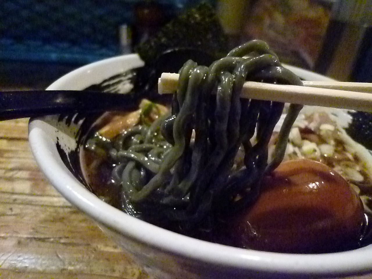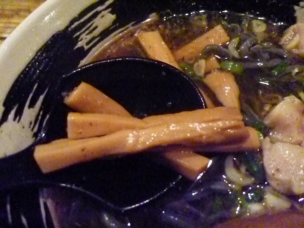 麺は真っ黒な中太の強縮れ。見た目のインパクトがものすごいんですがぷるぷるした食感に強靭なコシがあってかなり秀逸。並でお願いしましたがけっこうな量に感じておなかいっぱいになりました。