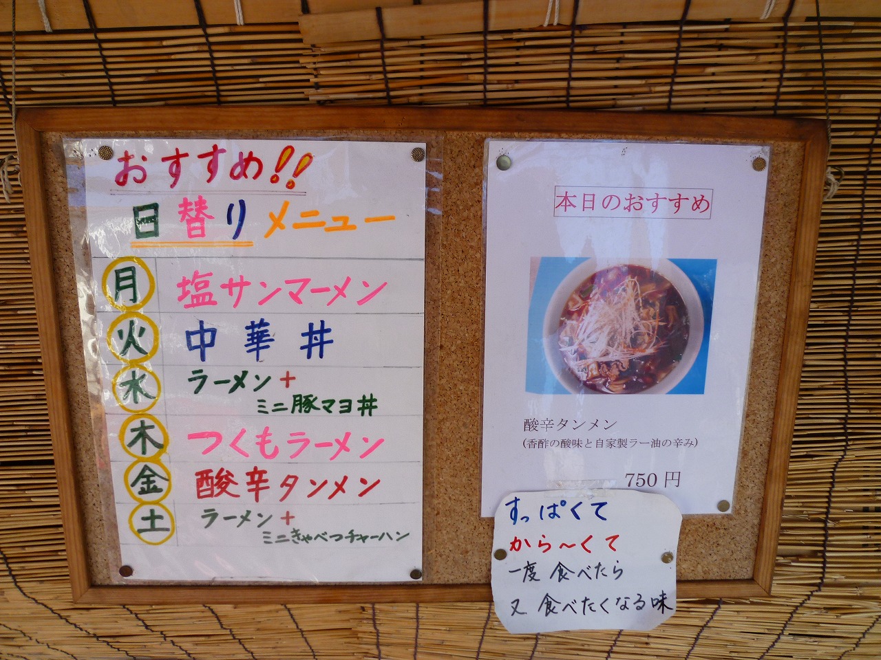 まず目に付くのは店頭の日替わりメニュー。曜日ごとになにかをやってるようで。