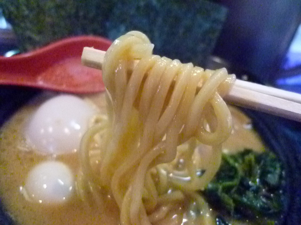 麺は太ストレート。松壱家より一回り太くもちもちした食感。松壱家より強く感じたスープにはこの太さが正解なんでしょうね。