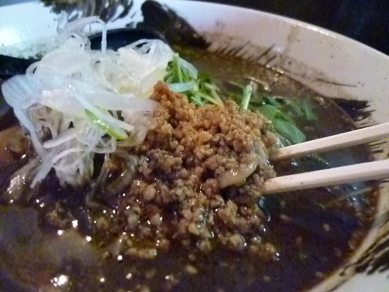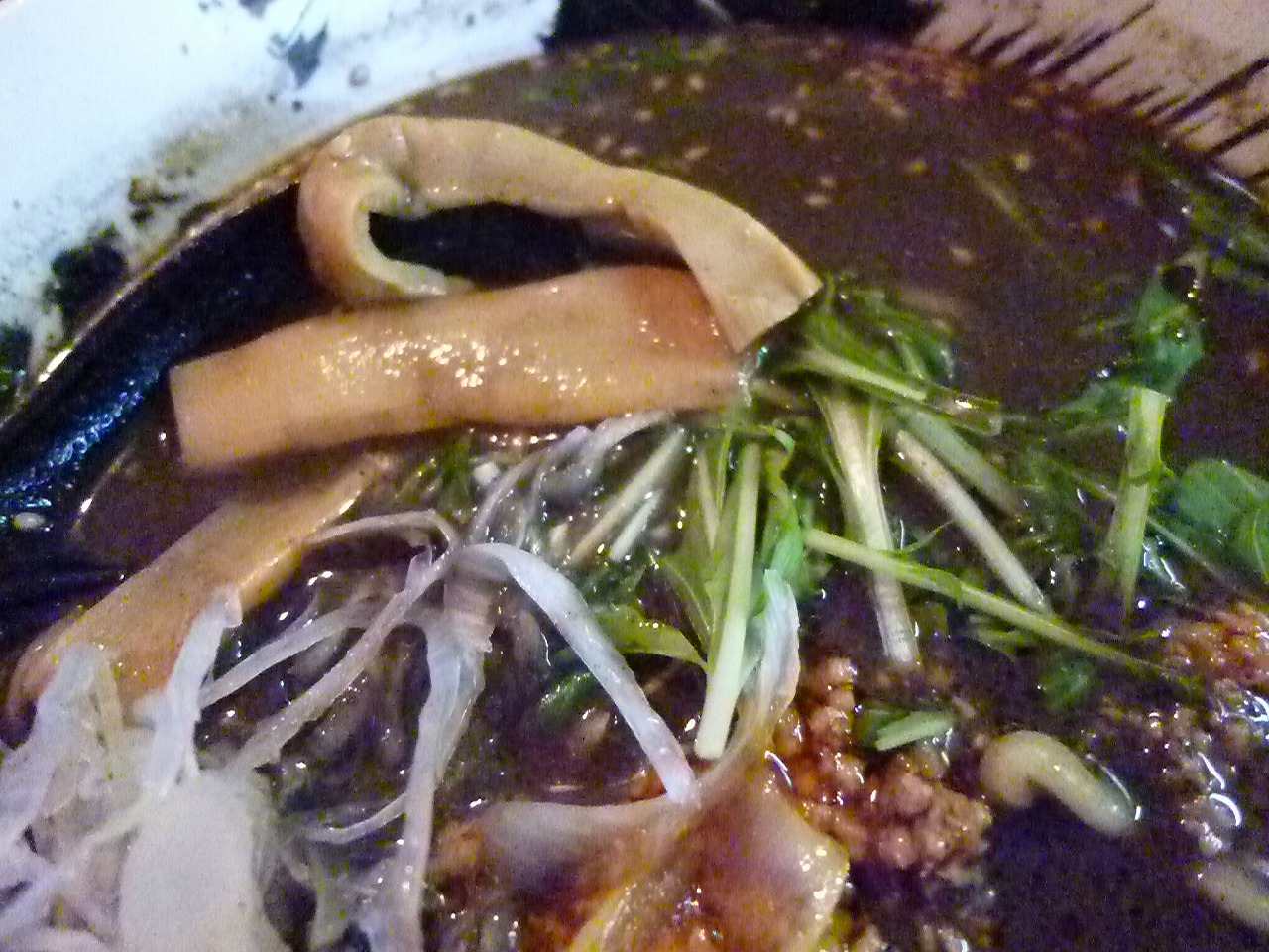 白ネギはしゃきしゃきで辛みが少ないところをみるときちんとさらしてある模様。水菜はぱりぱりでほのかな苦味が舌を洗ってくれて共に口直しとして申し分なし。メンマは柔らかしゃくしゃくでいろんな歯ごたえが飽きずに食べ進めることができました。