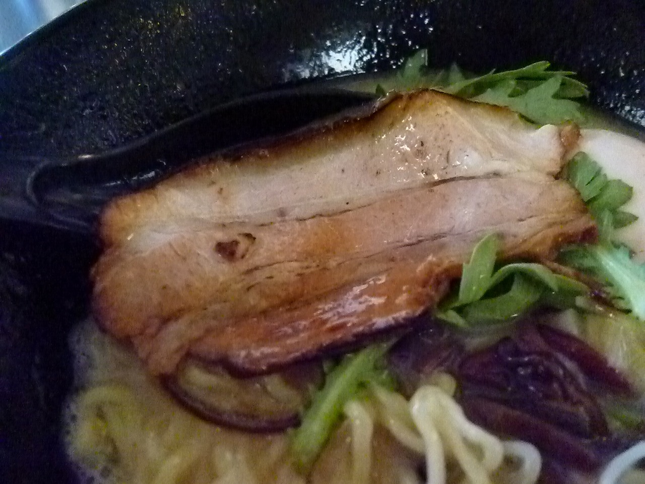 チャーシューは脂身少なめのバラスライスが1枚。しっとりと柔らかく醤油ベースの味付けがはっきりしてて大変に美味しいですが量的には寂しいかな。質としては最上として差し支えないです