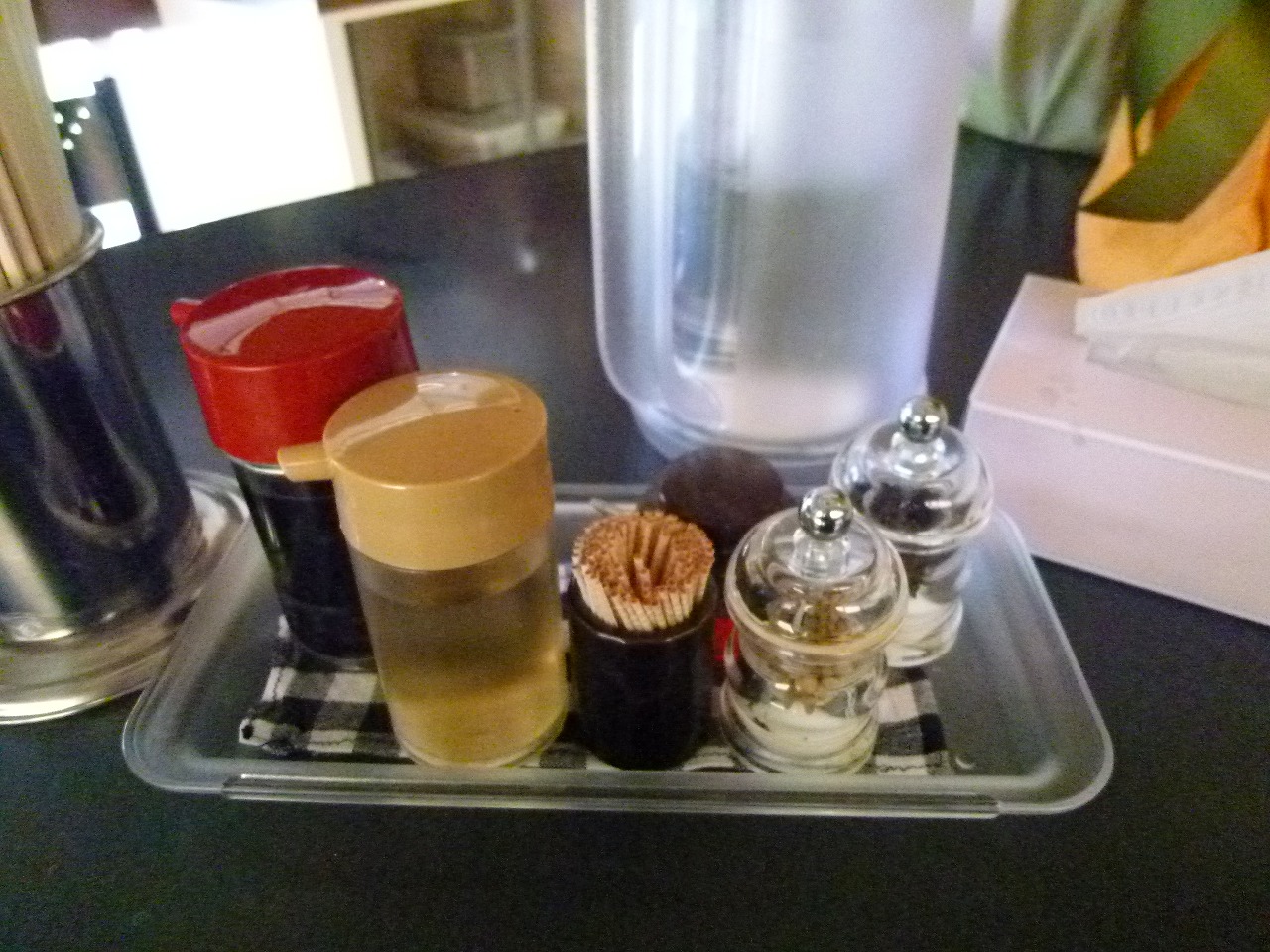 卓上調味料は白黒それぞれのペッパーミルに餃子用。ゆず胡椒は置いてないか。