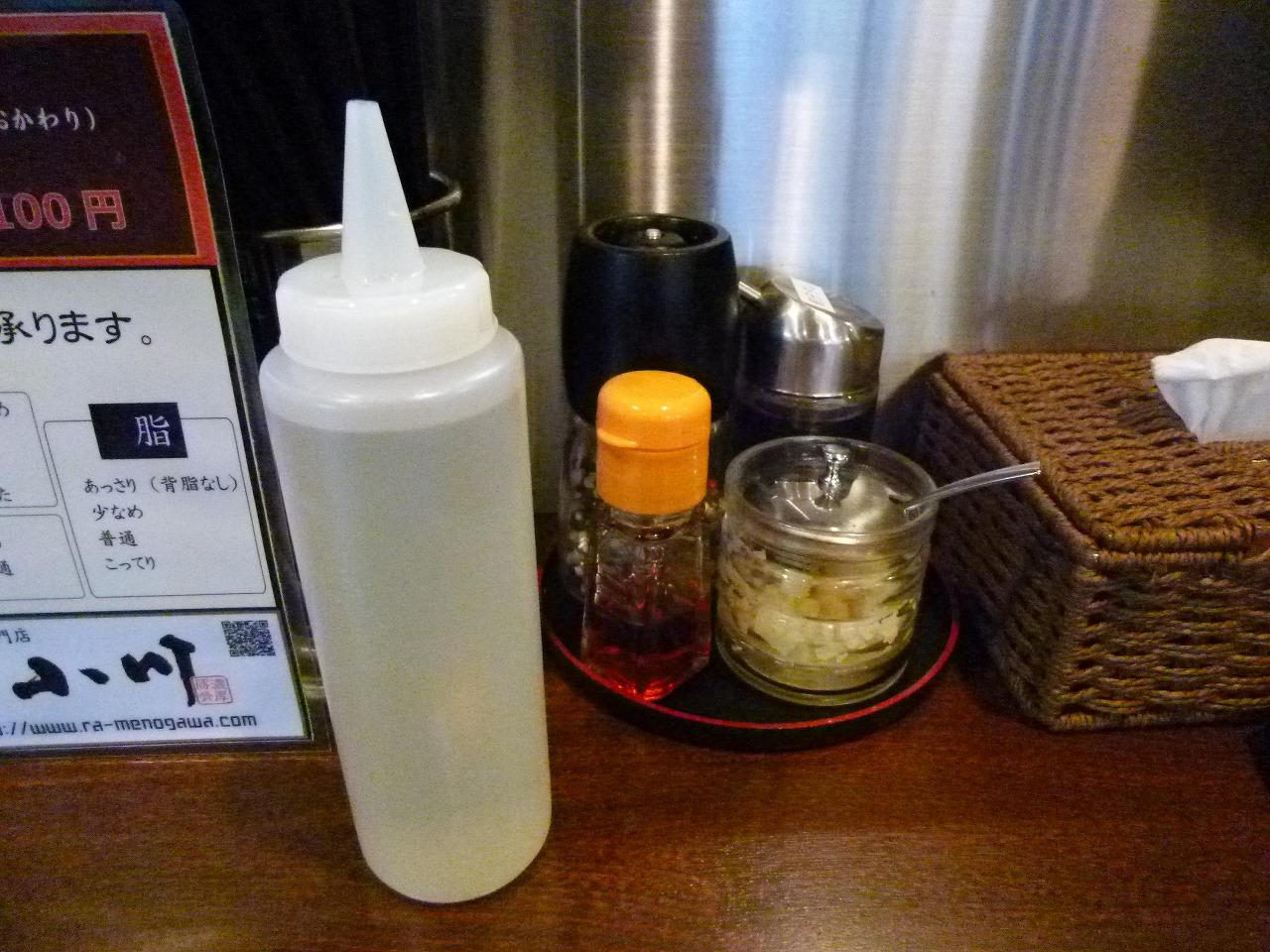 卓上には基本調味料に塩ダレも用意されてます。にんにくは刻みで入れ放題、味濃いめがありませんが濃い方向になら塩ダレで好きなだけ濃く出来ます。