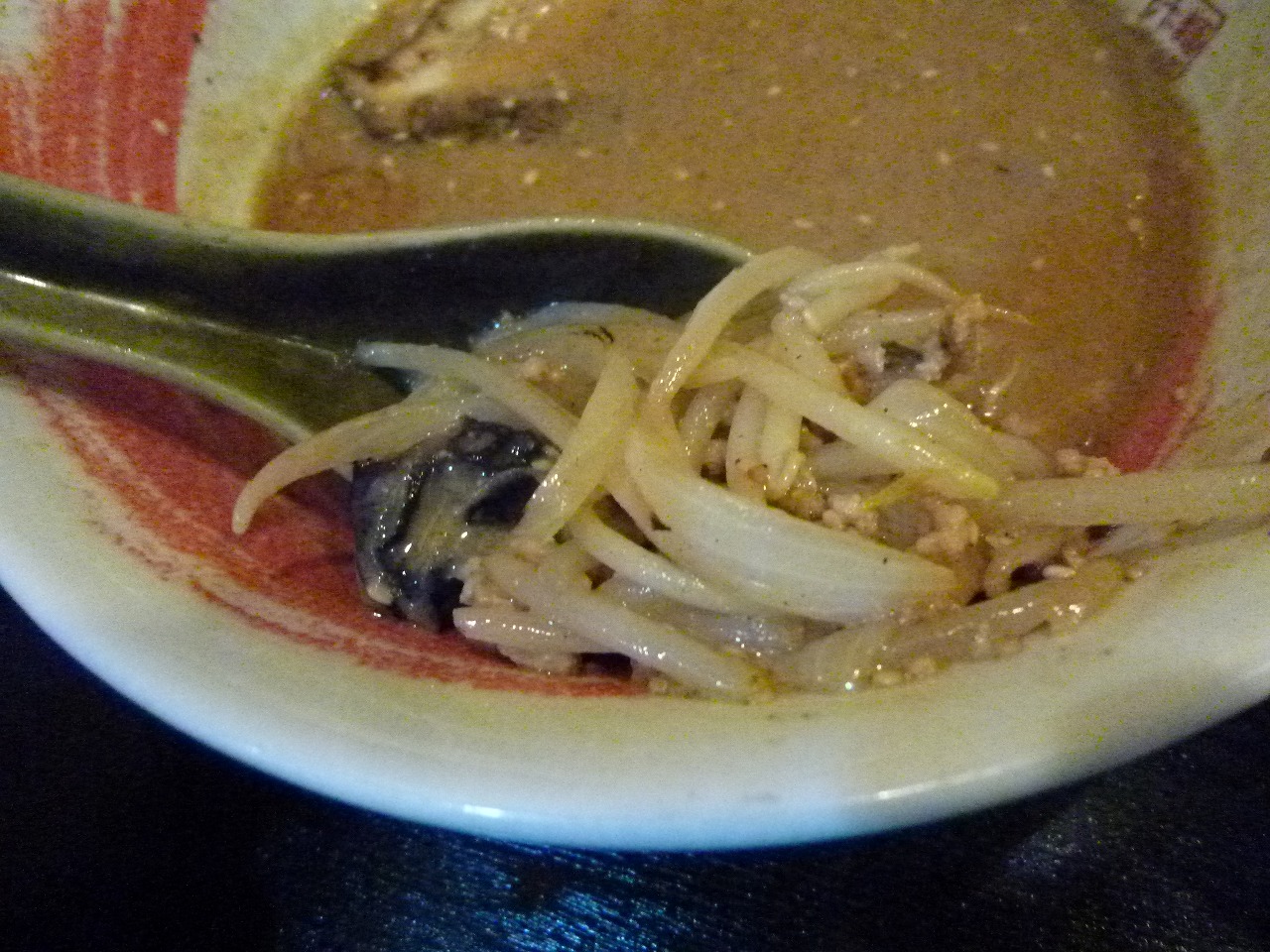 つけ汁の中には多めのもやしに甘い玉ねぎクッキクキのキクラゲも。ふんだんにひき肉が入りチャーシュープラスのオニク満足感があります。大きな器にたっぷりした量でお腹いっぱいになれますね。