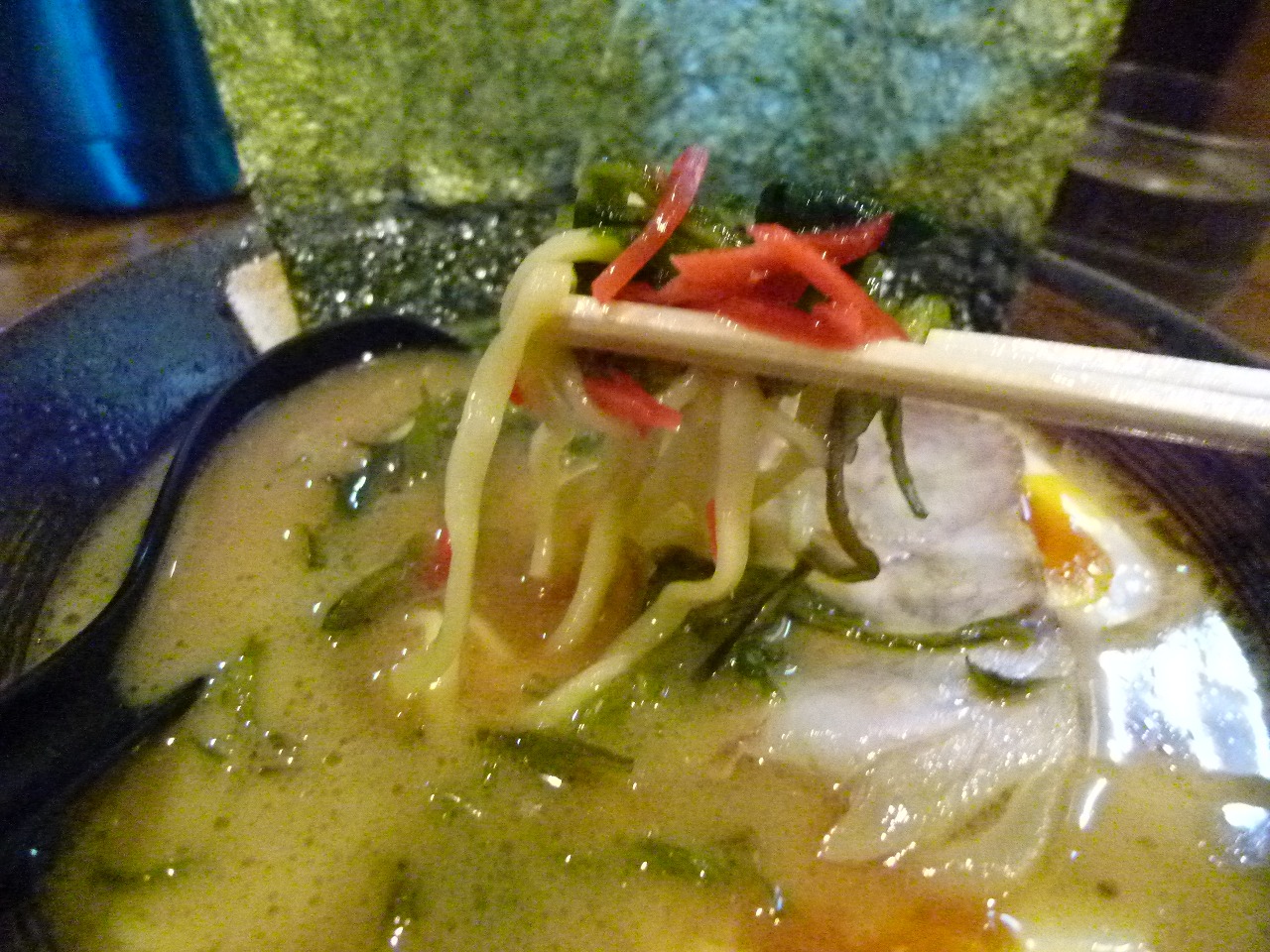 卓上の紅生姜を加えて茎わかめや麺と一緒に食べてみました。もちもちの麺にクキクキの茎わかめシャキシャキの歯ごたえに鮮烈な紅生姜の加わって渾然とした味わいを楽しめました。