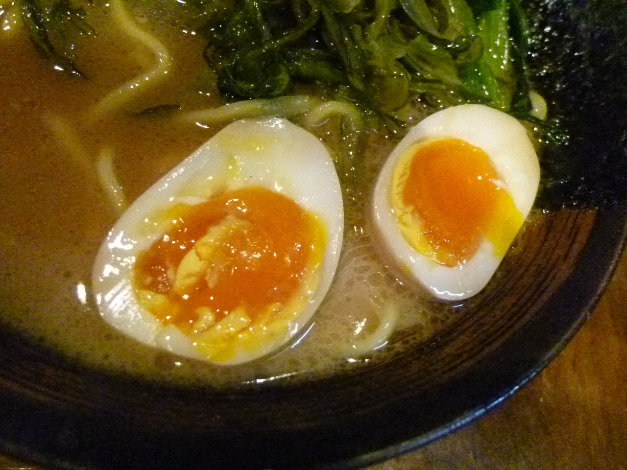 半熟加減が見事な味玉はきりっとしたしょっぱさがアクセントになります。基本濃い味の家系ではこれくらいインパクトがあった方が記憶に残るというものです。