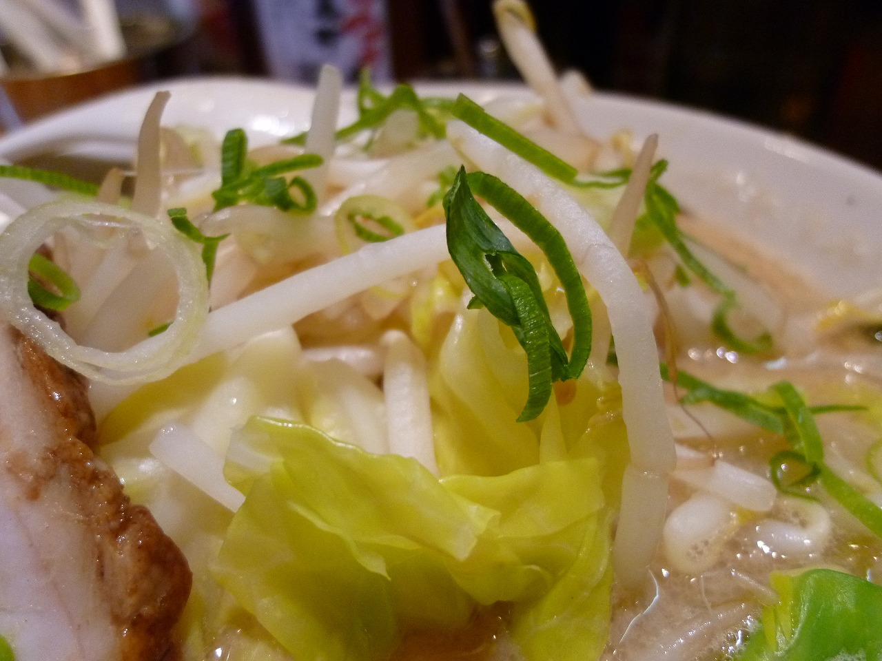野菜はキャベツともやしが半々くらい?ポキポキのもやしに甘いキャベツで量の方はおれでも軽く完食できるくらいのもの。でも、普段野菜をあまり摂らない不摂生人間にはありがたいですな。