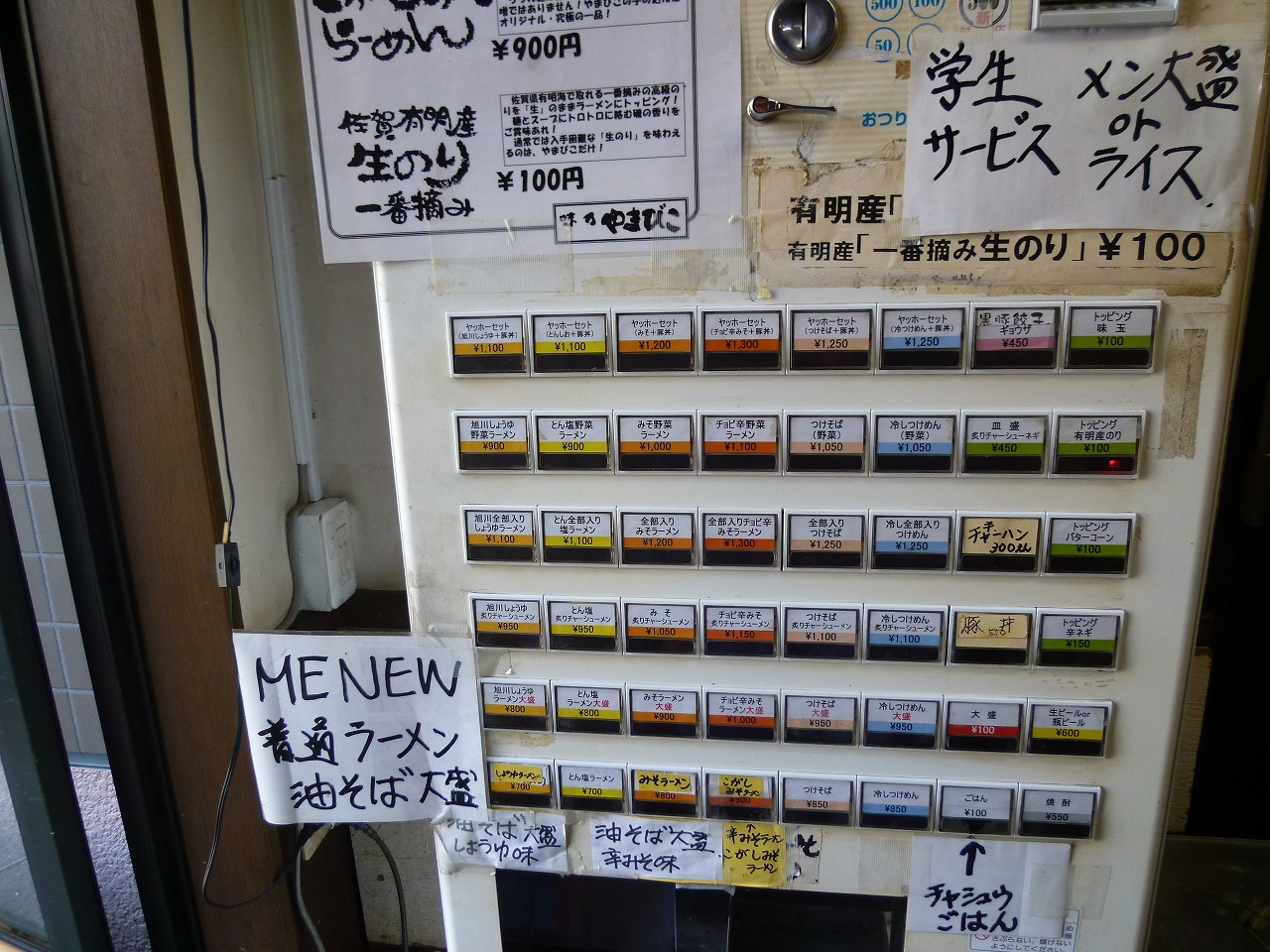 なんだかよく分からないポップが貼られた券売機。入って左なんですがただでさえセット推しな配置にMENEWは非常に難解。なんかダジャレてるんかな。ちなみにぶた丼は現金注文になってます。