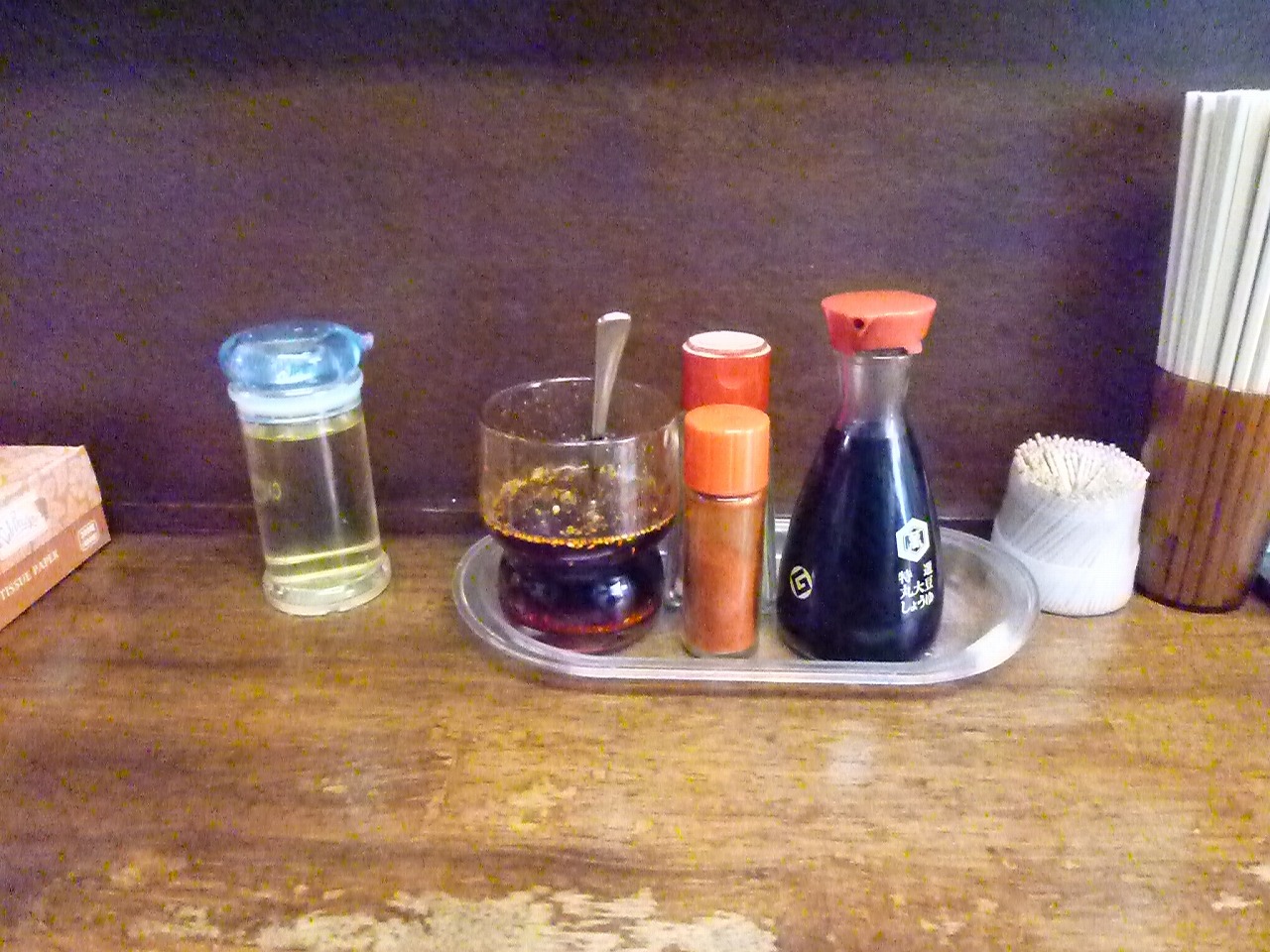 卓上には手作りとおぼしきラー油が特徴的。なんか蓋をしてほしいと思うのはおれだけ?