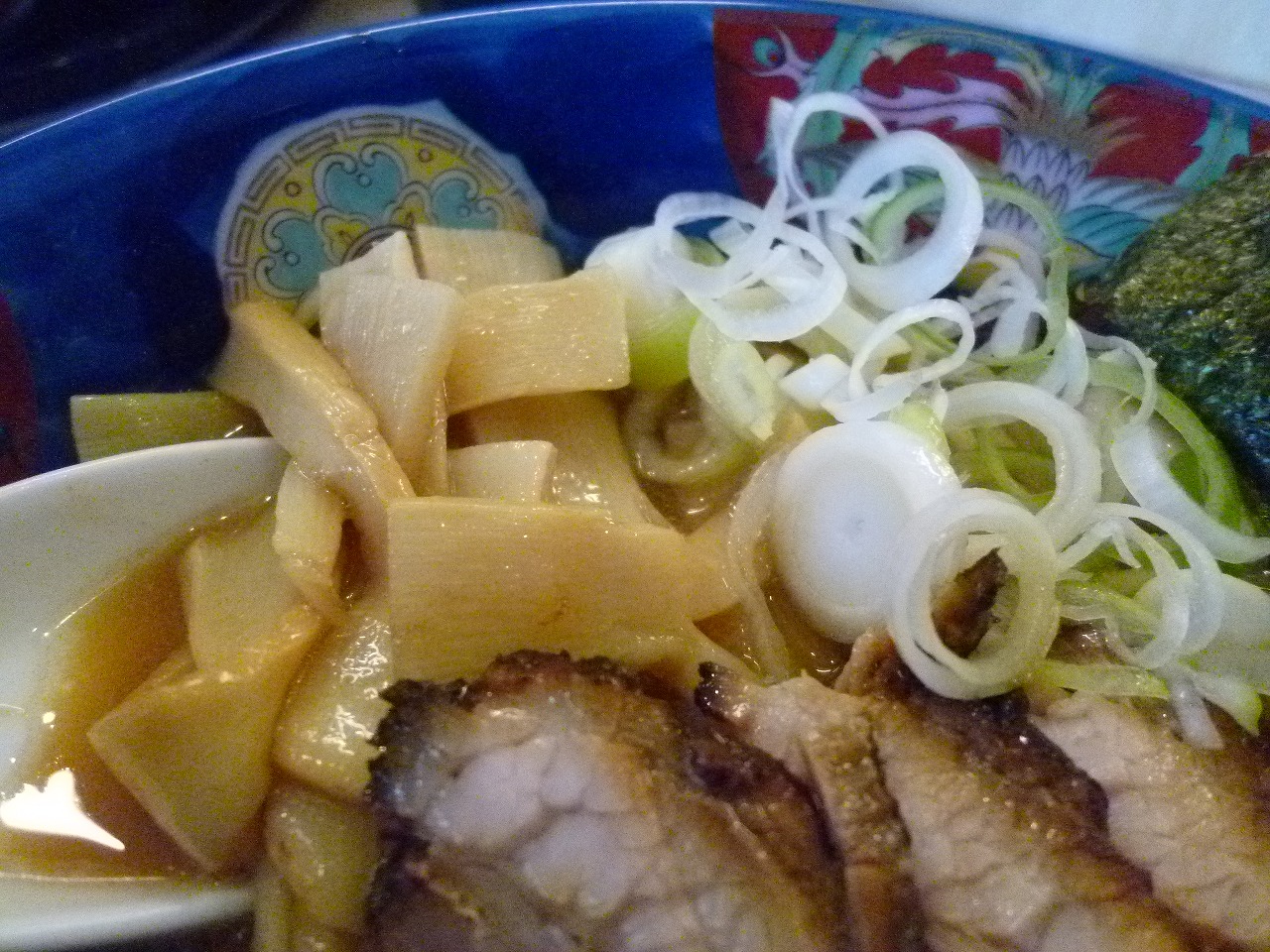 脇にはシャキシャキメンマに輪切りねぎが多め。濃厚スープにたっぷりチャーシューが圧倒しそうなところに脇役がいい仕事しちゃってさ。