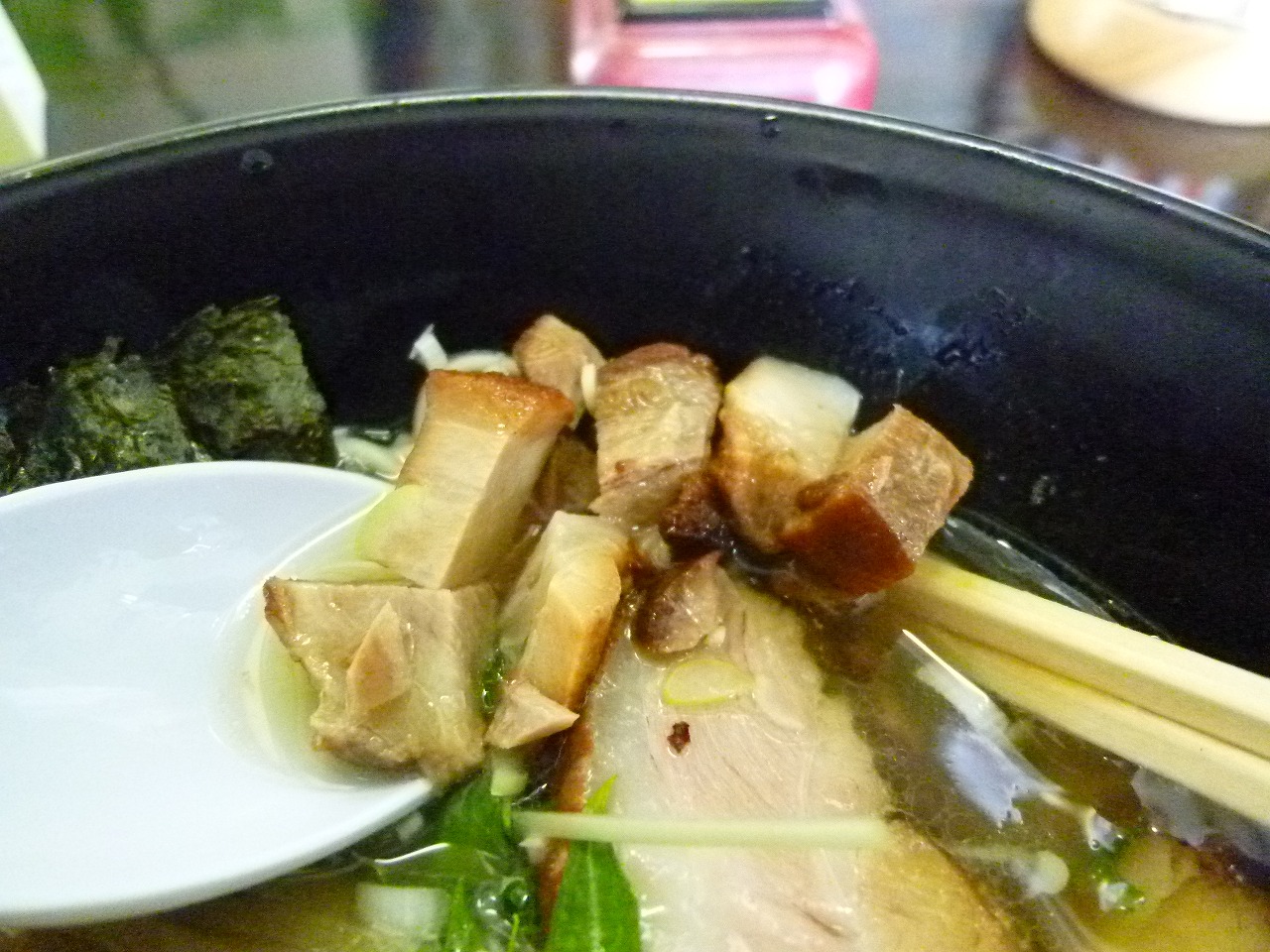 チャーシューは厚切りのバラ。しっとりした食感に噛めばほんのり甘い味付けが染み出てきて大変に美味しいですね。1枚でも十分に満足できるボリュームですが増しにしたことでもう1枚プラス!