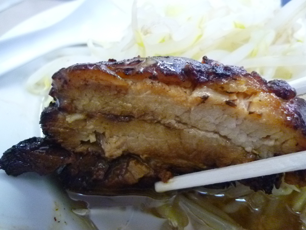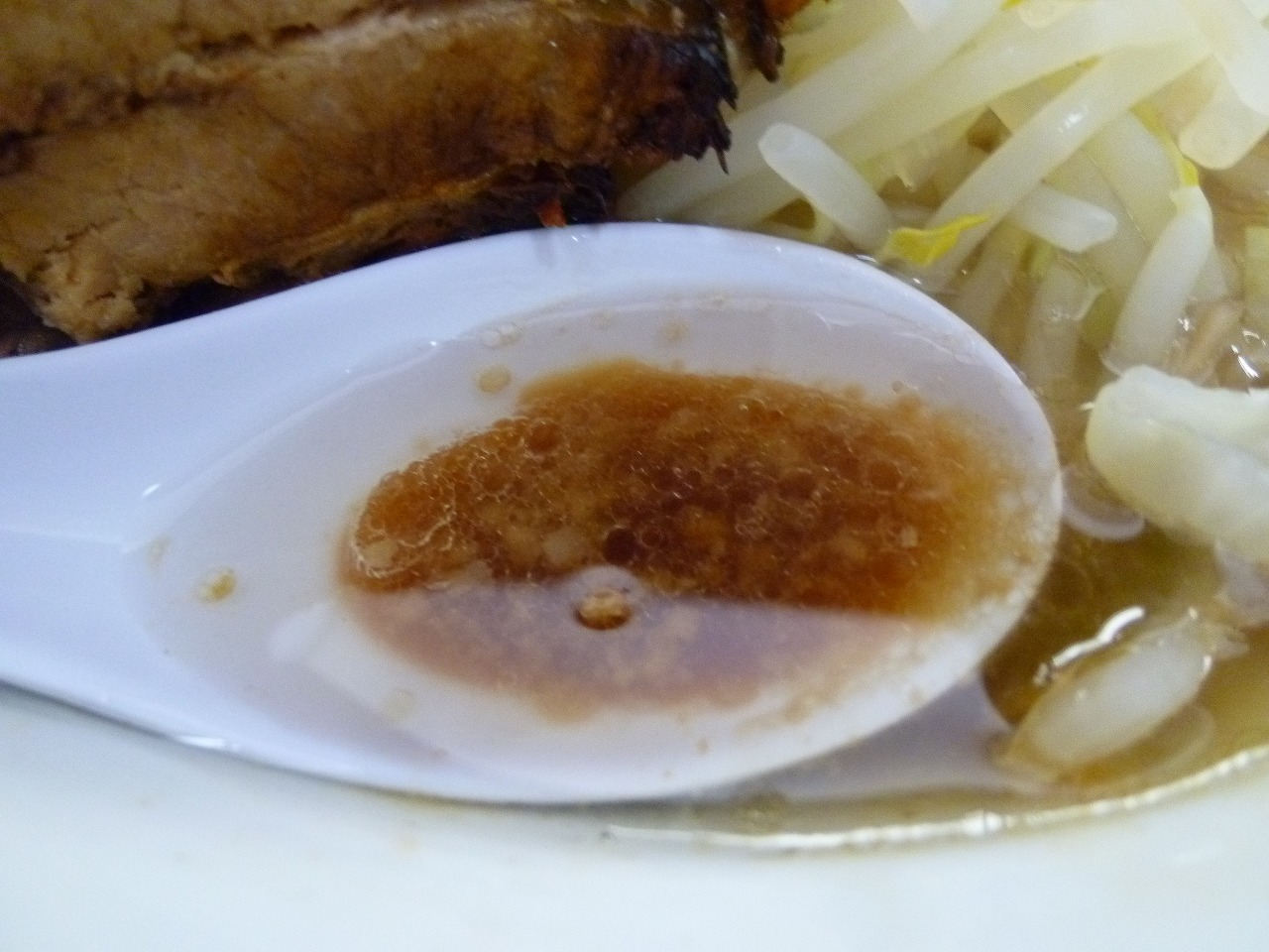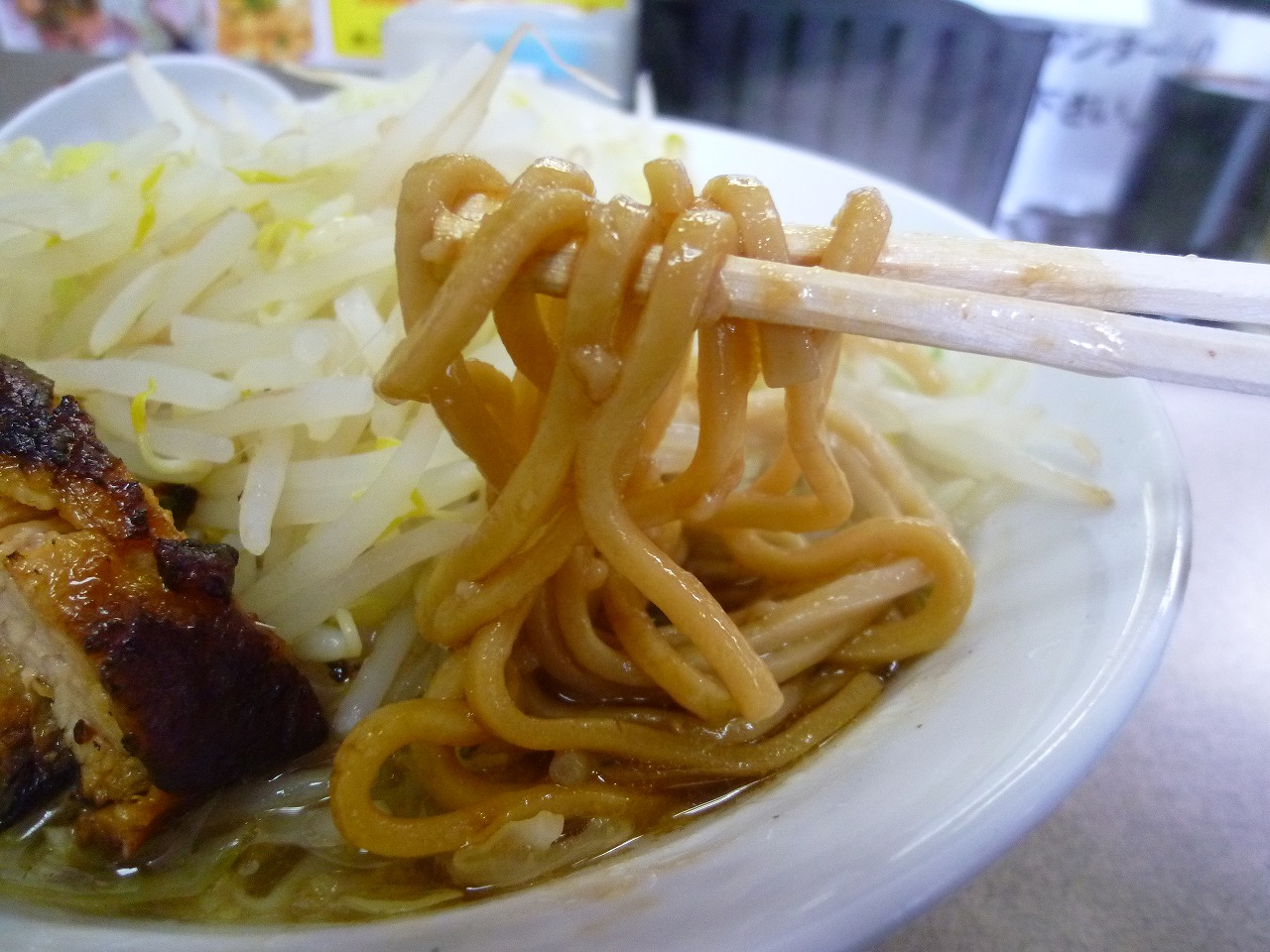 麺は低加水極太でがっしりごわごわなストレート。ありゃ、こんなにまで強い麺だったかな。甘辛ぶた風味のこってり味ががっちり付いてきてそういう意味でもレンゲの必要がありませんでした。