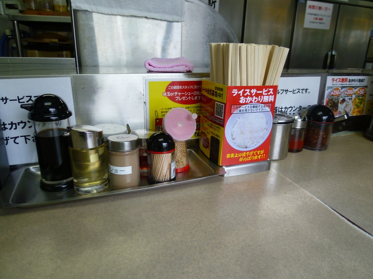 卓上調味料はけっこう豊富。衛生管理上の面からか申告制になってますが玉ねぎも無料でオーダーできます。