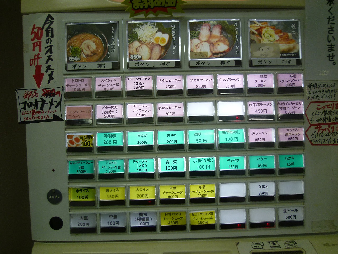 2台ある券売機の内の家系サイド。とんこつ醤油が基本ですが塩に味噌も揃ってます。