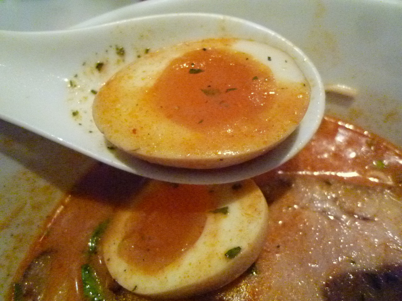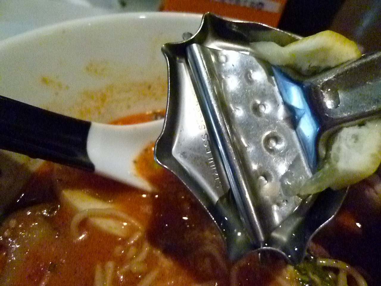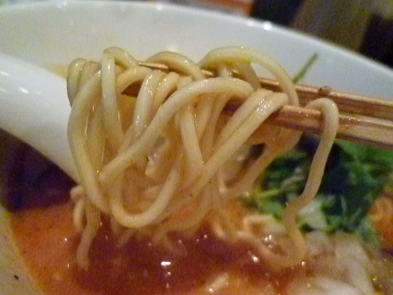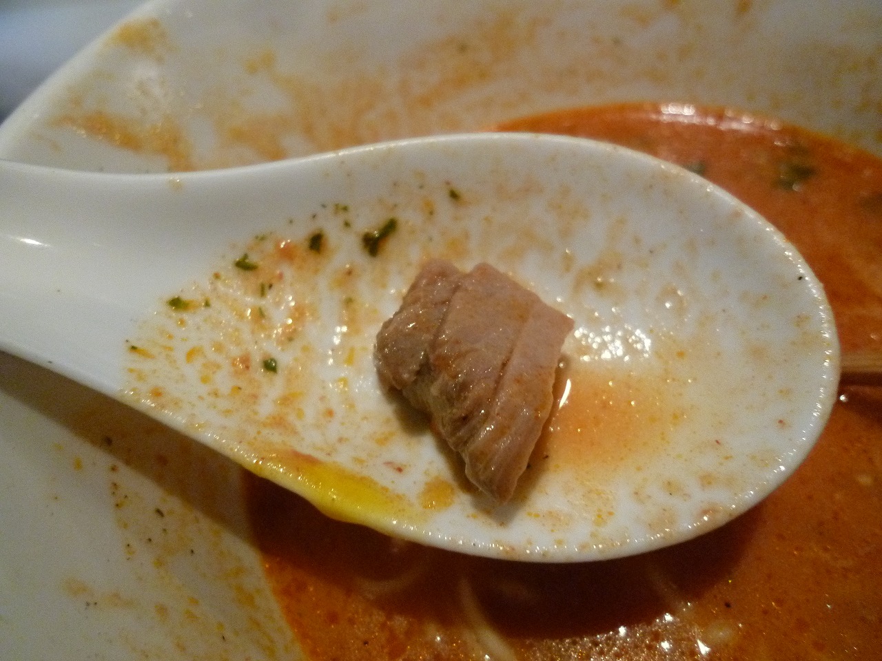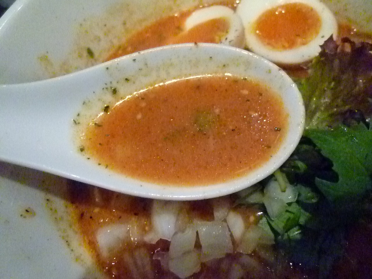 とろりとした口当たりに鋭い酸味、複数の香味が利いたスープはトマトを存分に感じて印象としてはリコピンリコピン。後述する野菜系の具との相性は特筆すべきものでした。