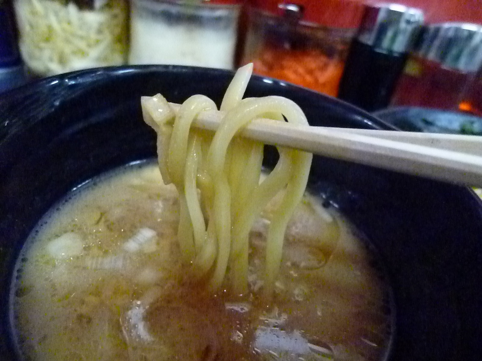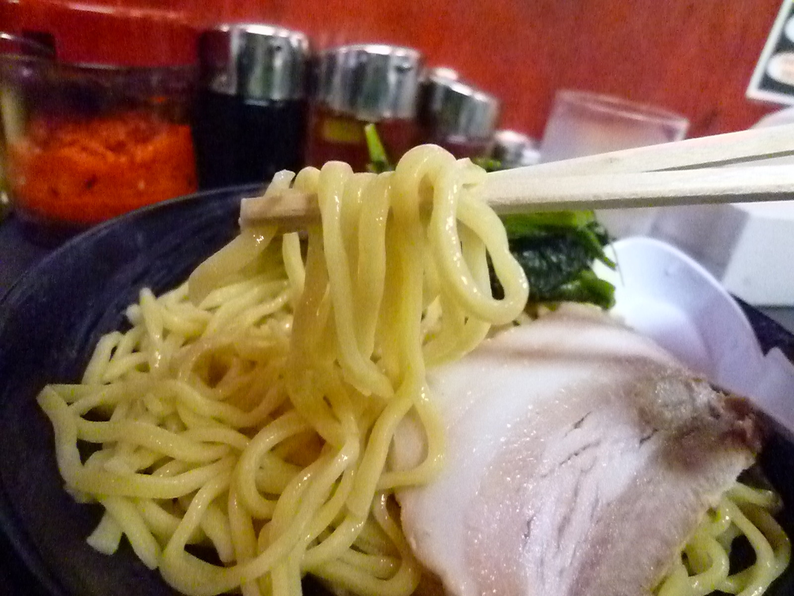 麺は長多屋製麺の中太平打ち。ああ、家系つけ麺だから麺は家系仕様なのね。