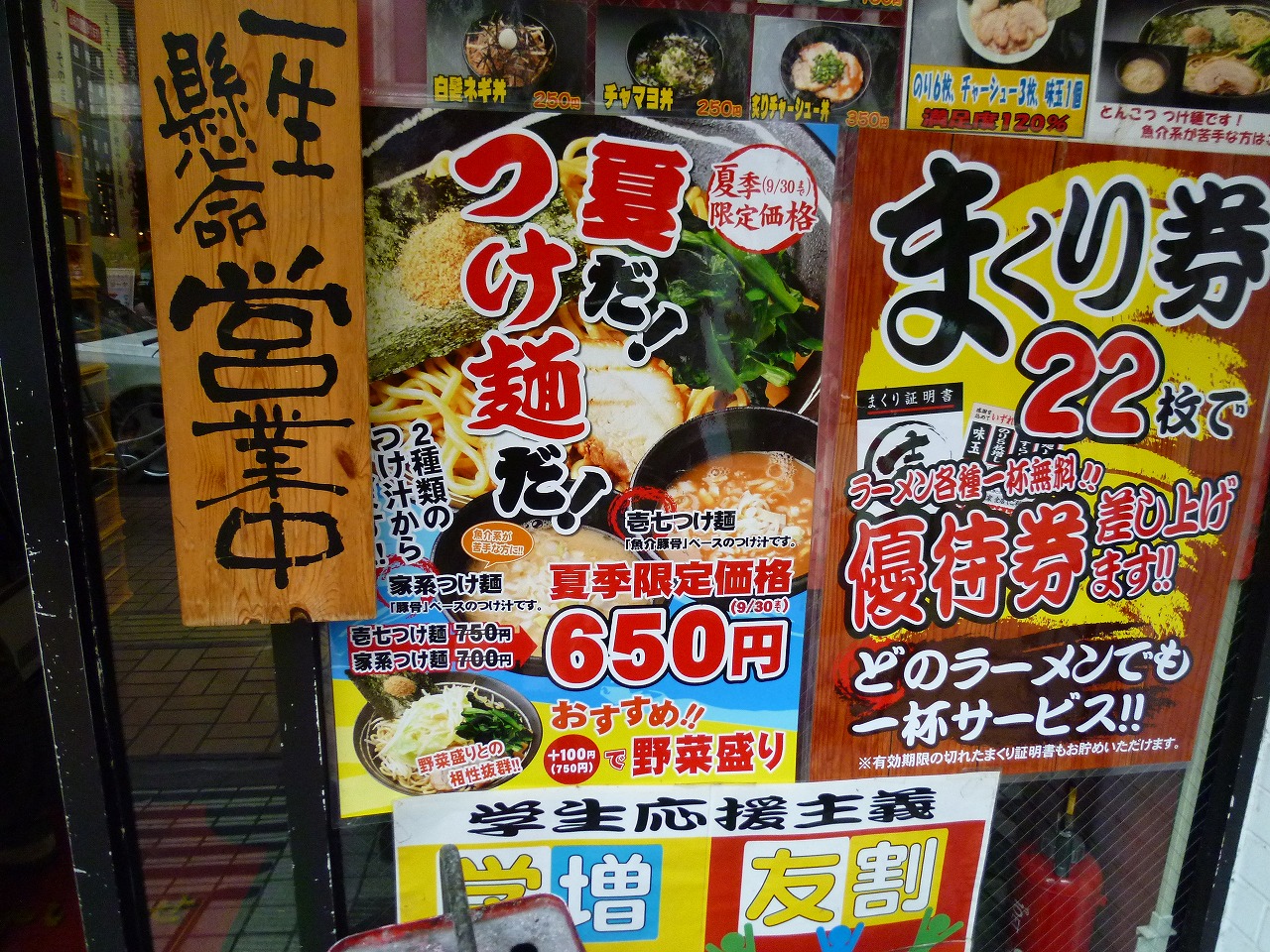 とはいえ夏にはやはり客足が鈍るのでしょうか、つけ麺割引きのサービスが限定で。