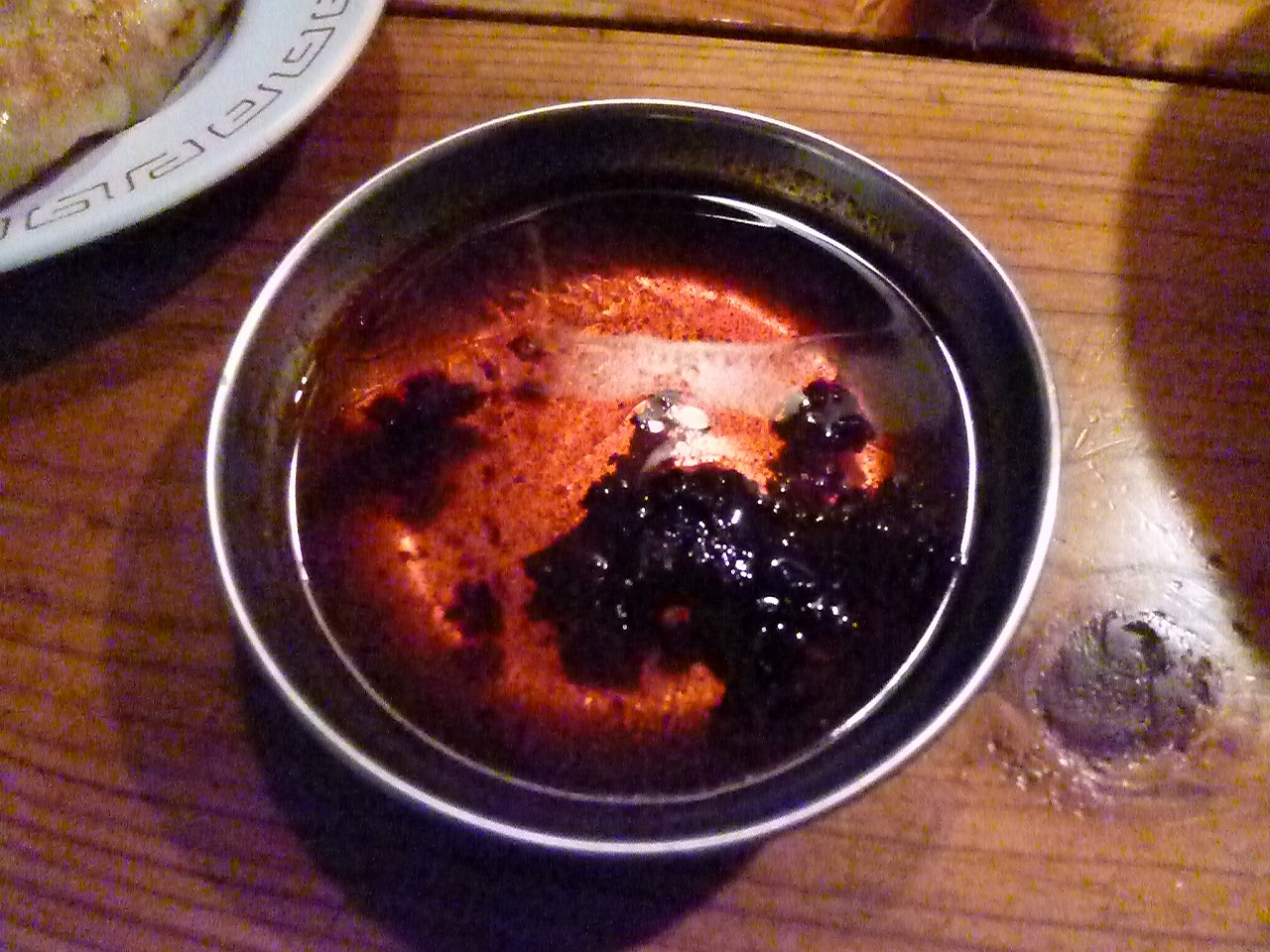 まずは提供される小皿に半分ほど卓上のタレを加えて自家製ラー油をお好みで。