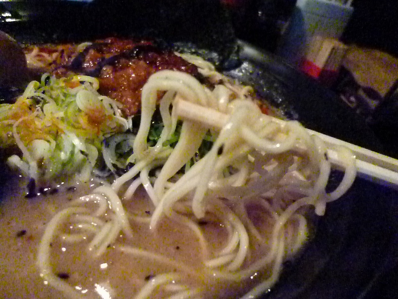 肉味噌を溶くまではとても優しくあっさりしたとんこつスープ。これだけでも全然おいしくいただけます。