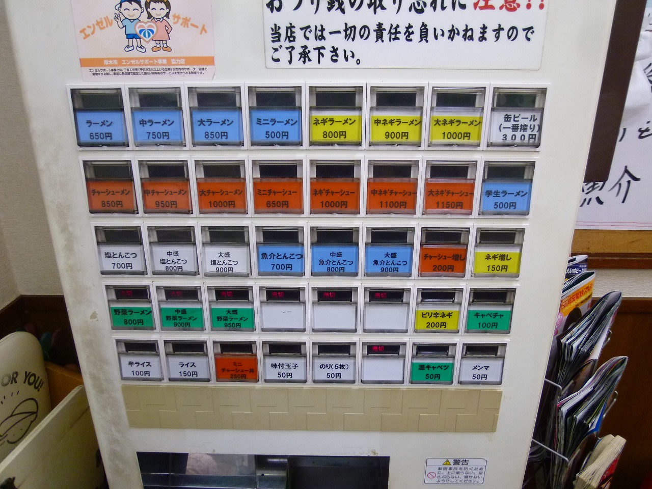 店に入って左奥にある券売機。横浜家系とんこつ醤油を基本にして塩に魚介とんこつの3本立てになります。六角家系には珍しく50円トッピングが充実していていろいろ楽しめるほかトッピングサービス券も出してくれるんで