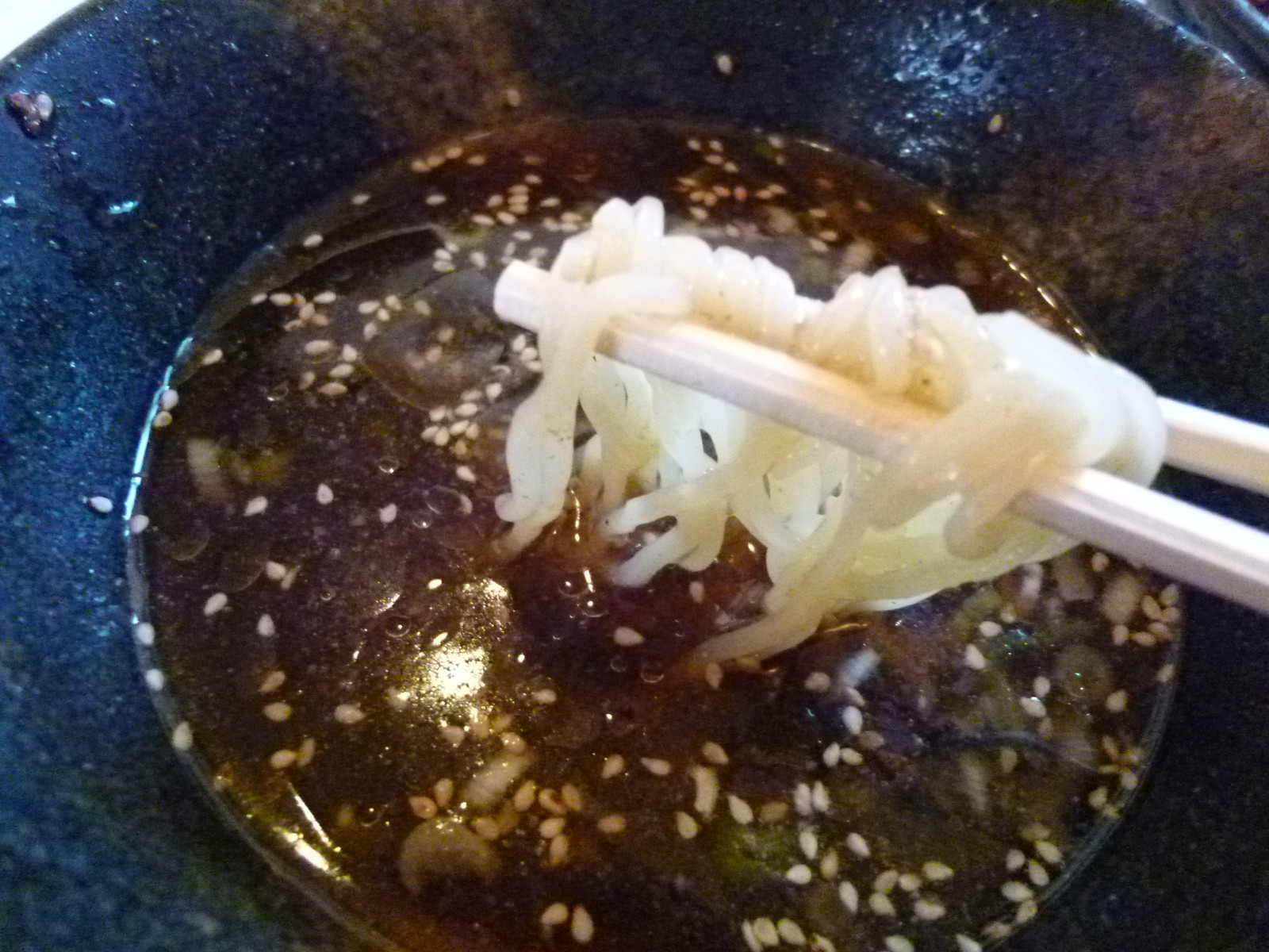 同行者の注文です。酸味や甘みはオフ、塩のスープにゴマやラー油で変化を付けてますがダシに相当な自信がなければ出せないであろう出来になってます。おれが食べたかったのに、チッ!
