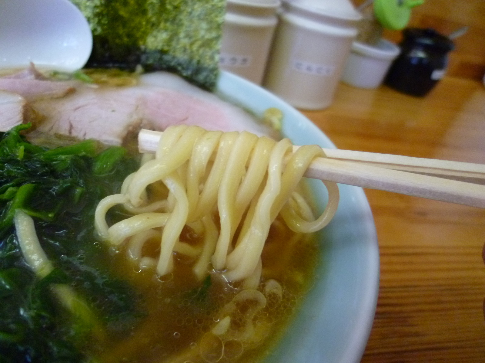 卓上には家系基本調味料に生姜や醤油ダレに粗挽き唐辛子も用意されてます。辛いラーメンにするもニンニクガッツリにするもお好み次第。せっかくのサービスだから遠慮なく利用しちゃいましょう。ま、こちらの場合は素が素晴らしいんですけどね。