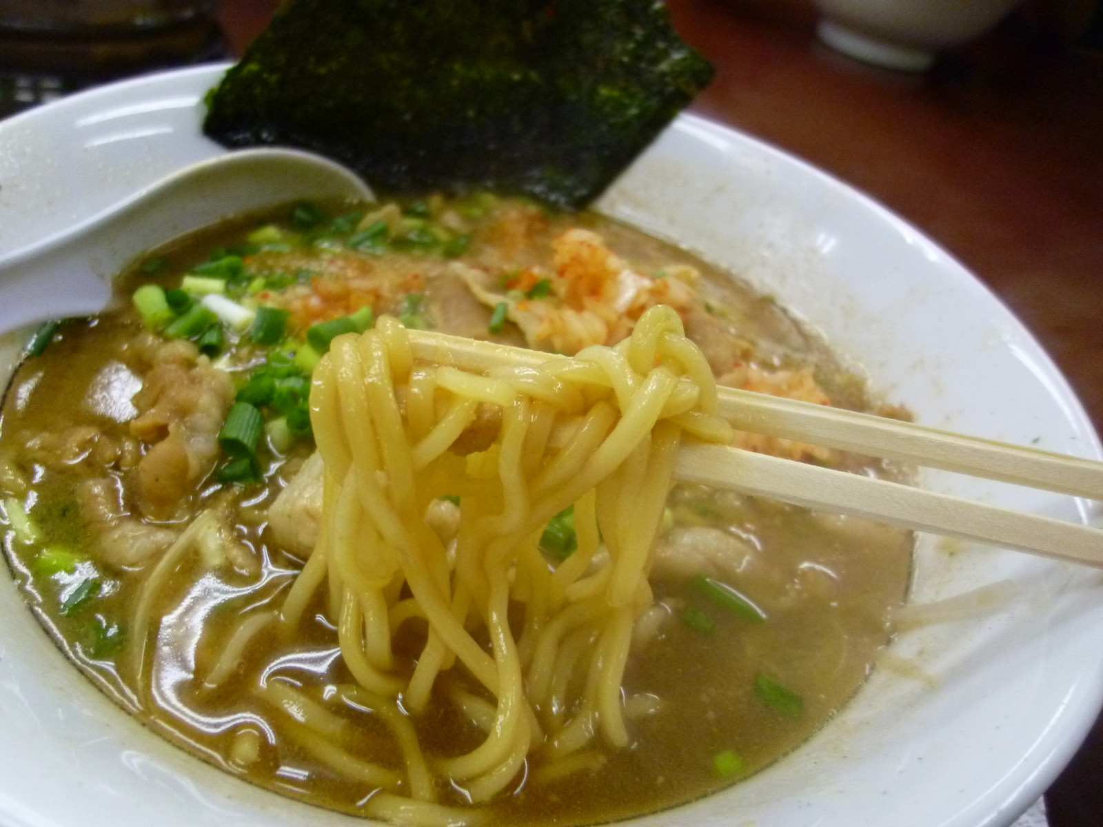 麺は中細の縮れ。スープのとろみが強くってめっちゃ絡んできました。あれ?旨い。