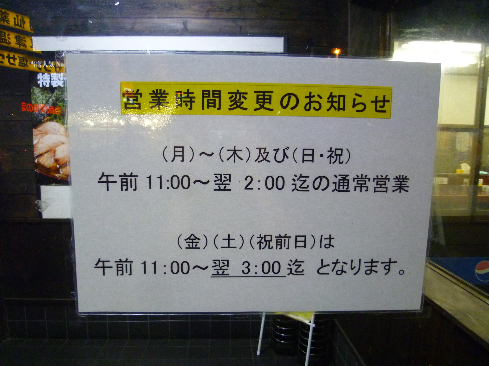 店頭に営業時間変更の告知がありました。てか、そもそも営業時間の表示がなかった気がするんですがどうやら今まで嘘の営業時間を書いていたわけではなかったみたいでちょっと安心。休み前の日は1時間延長するよ!ってことみたい。