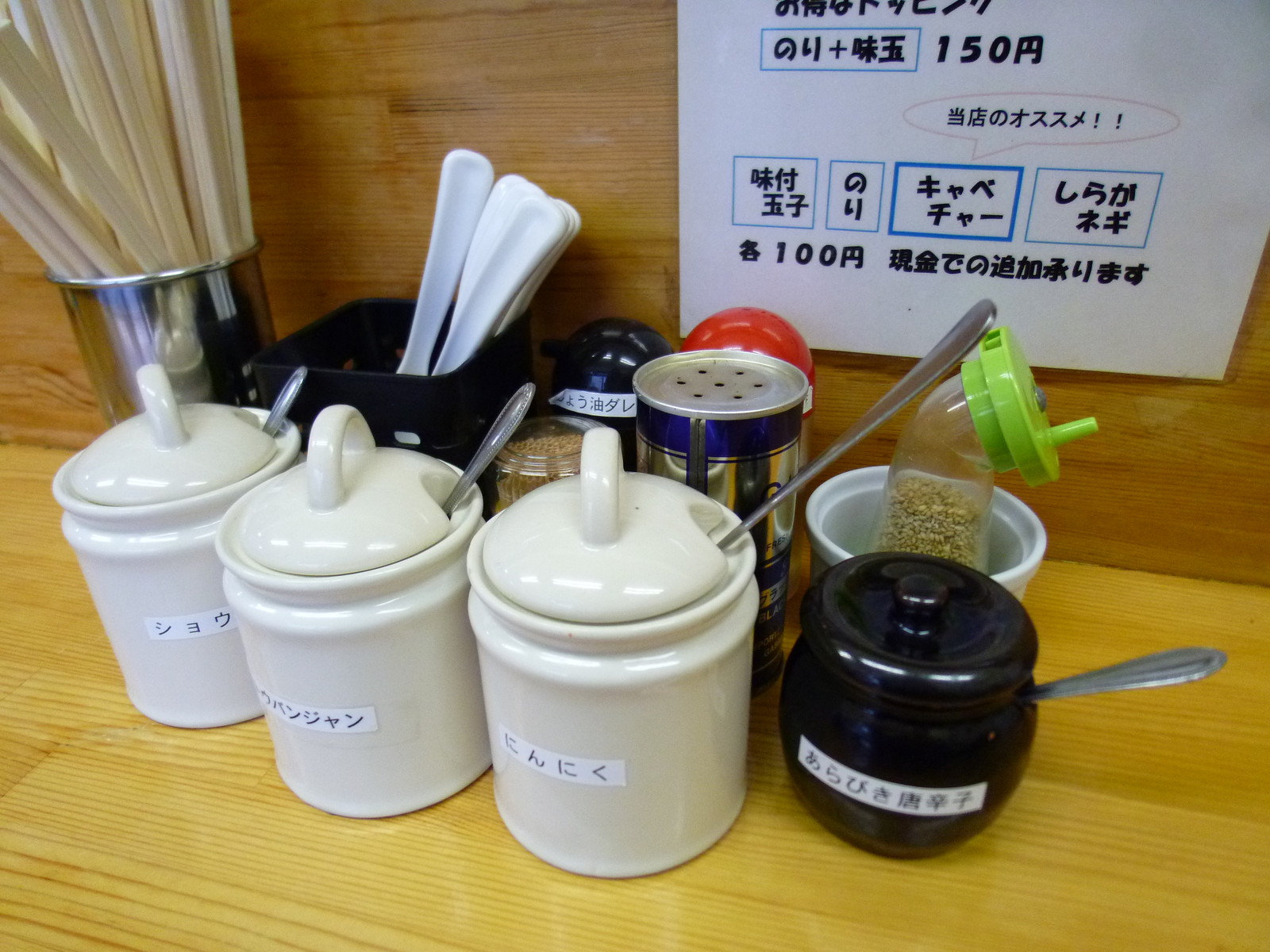 卓上には家系基本の他にショウガやあらびき唐辛子など。醤油ダレもあるんで味の調節も出来ちゃいます。