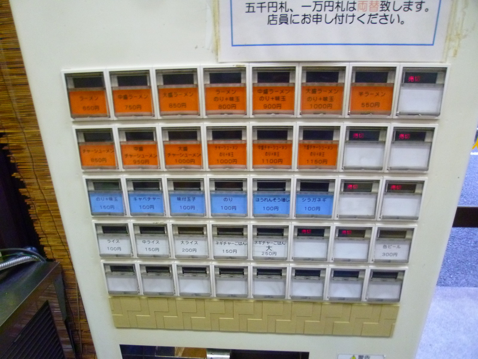 店に入って右手にある券売機。入口に対して背を向いてるんでスルーしやすいですが店員さんが丁寧に案内してくれるんで大丈夫。横浜家系とんこつ醤油の1本勝負でトッピングにより種類を出してます。