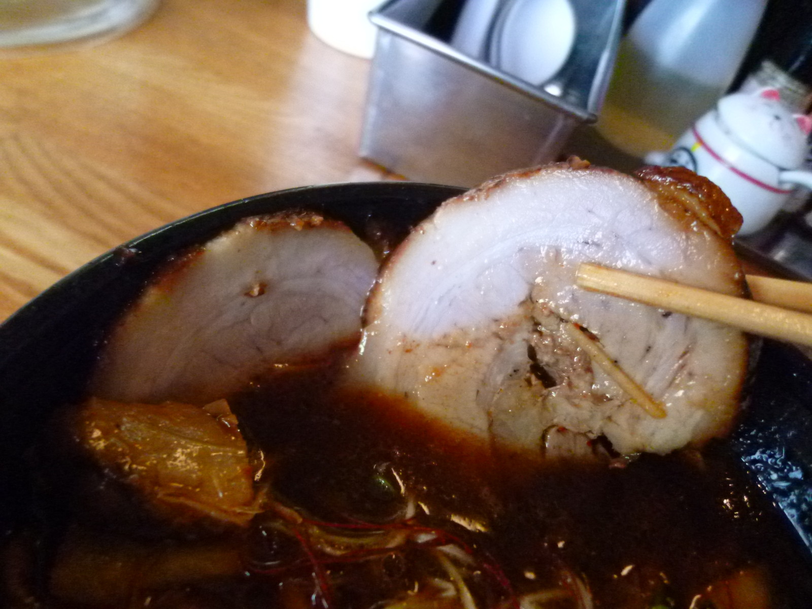 チャーシューは厚切りの巻きバラが2枚に底からはコロチャーがけっこう出てきてオニク満足感ありすぎ。あれま、こんなに肉が多かったっけな、とてつもない満足感です。