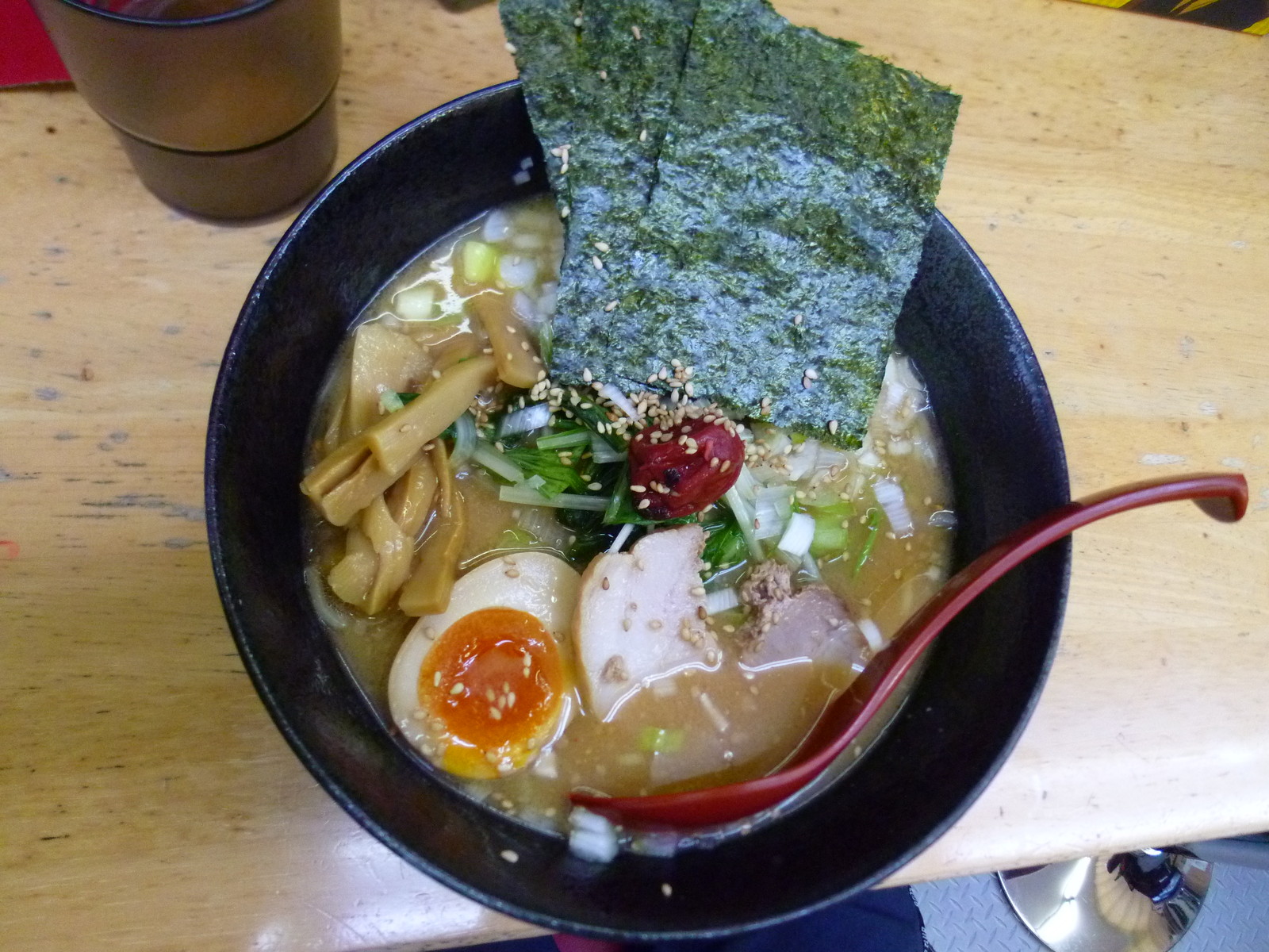 野菜系にはもやしに水菜にメンマ。梅干しが目を引きますね。スープに溶かしやすくていい味変えになりました。
